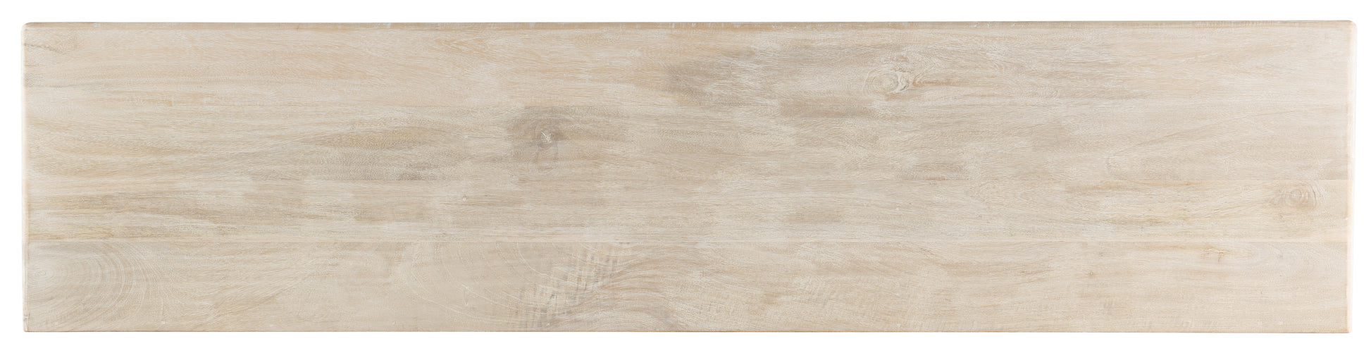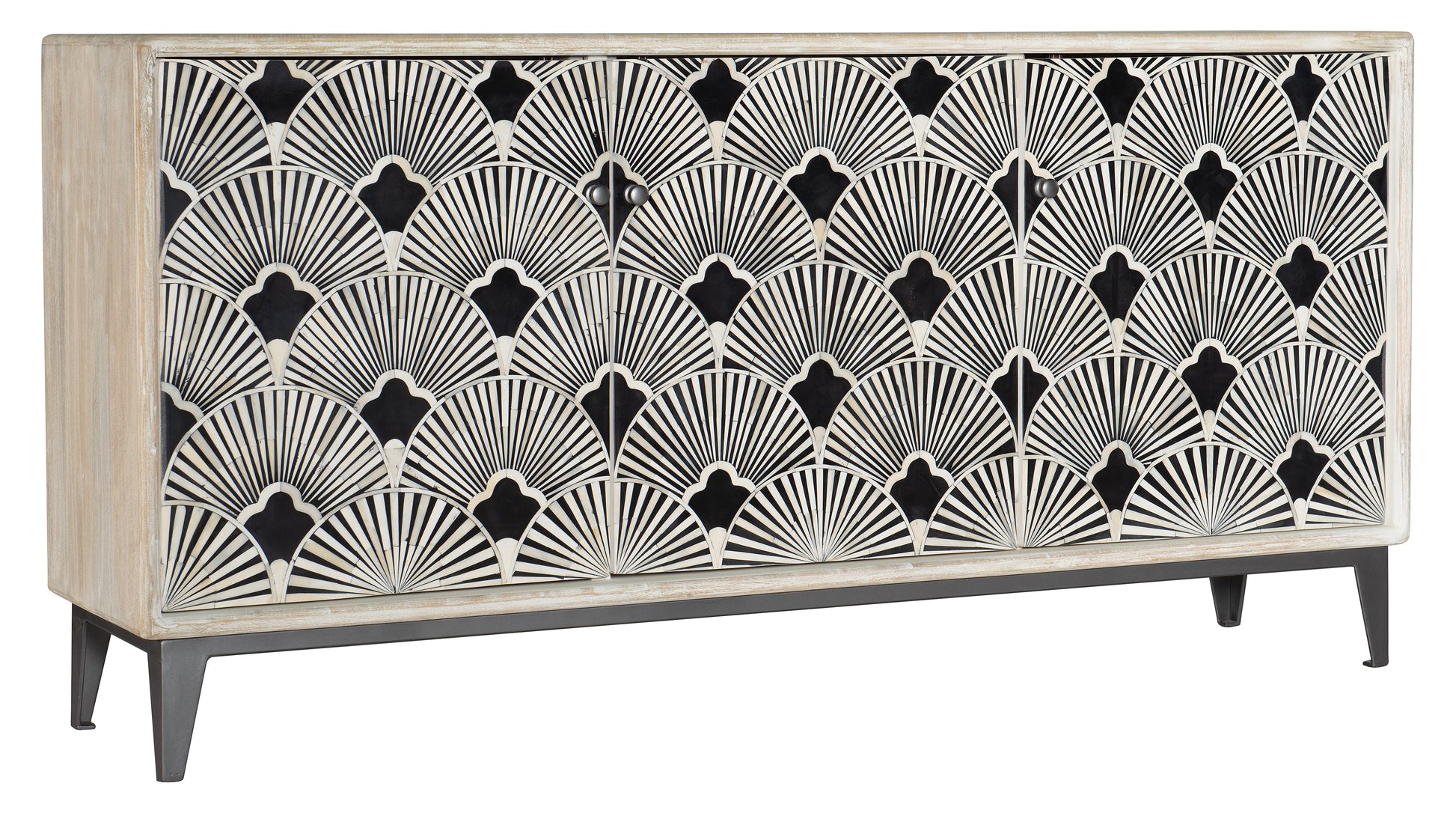 Contemporary and chic, this entertainment center combines natural materials and a classic black and white color scheme and shell motif to create a functional focal point. Crafted of Mango Wood with bone inlay, a natural wood finish on the outside of the case contrasts with black and white inlay on the door fronts and is complemented by a gray metal base and hardware and an off-white painted interior. There’s one removable shelf behind each door, a 3-plug electrical outlet, ventilated back panel and soft-close hinges on the doors.