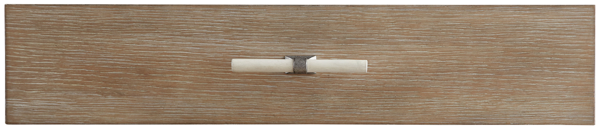 Sleek and sophisticated, the Affinity Leg Nightstand blends a simple one-drawer top with a pewter and antique white bar pull with an intriguing base combining rounded X-motif legs and a center stretcher. Crafted of Oak Veneers, the nightstand is finished in a wire-brushed greige and antique white finish.