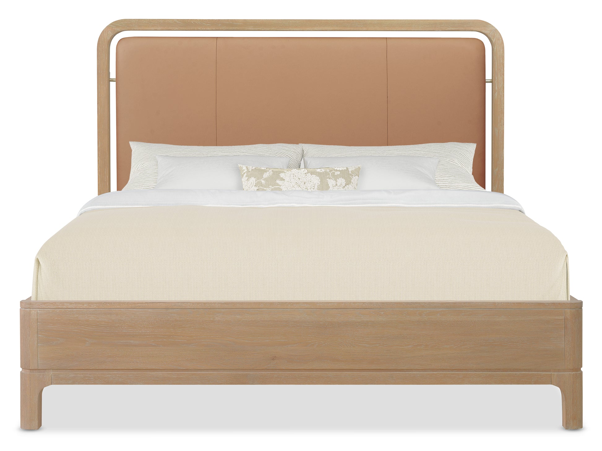 The Banyon Bay King Panel Bed in the Toast leather offers contemporary elegance with its combination of white oak solids, oak veneers, and finished leather. The Desert Oak finish, with wire-brushing and cerusing, adds texture and depth. The leather-upholstered headboard, supported by a sleek metal frame, makes this King bed a luxurious and modern focal point in any bedroom. Complete with a headboard, footboard, and rails, it blends organic materials with contemporary style.