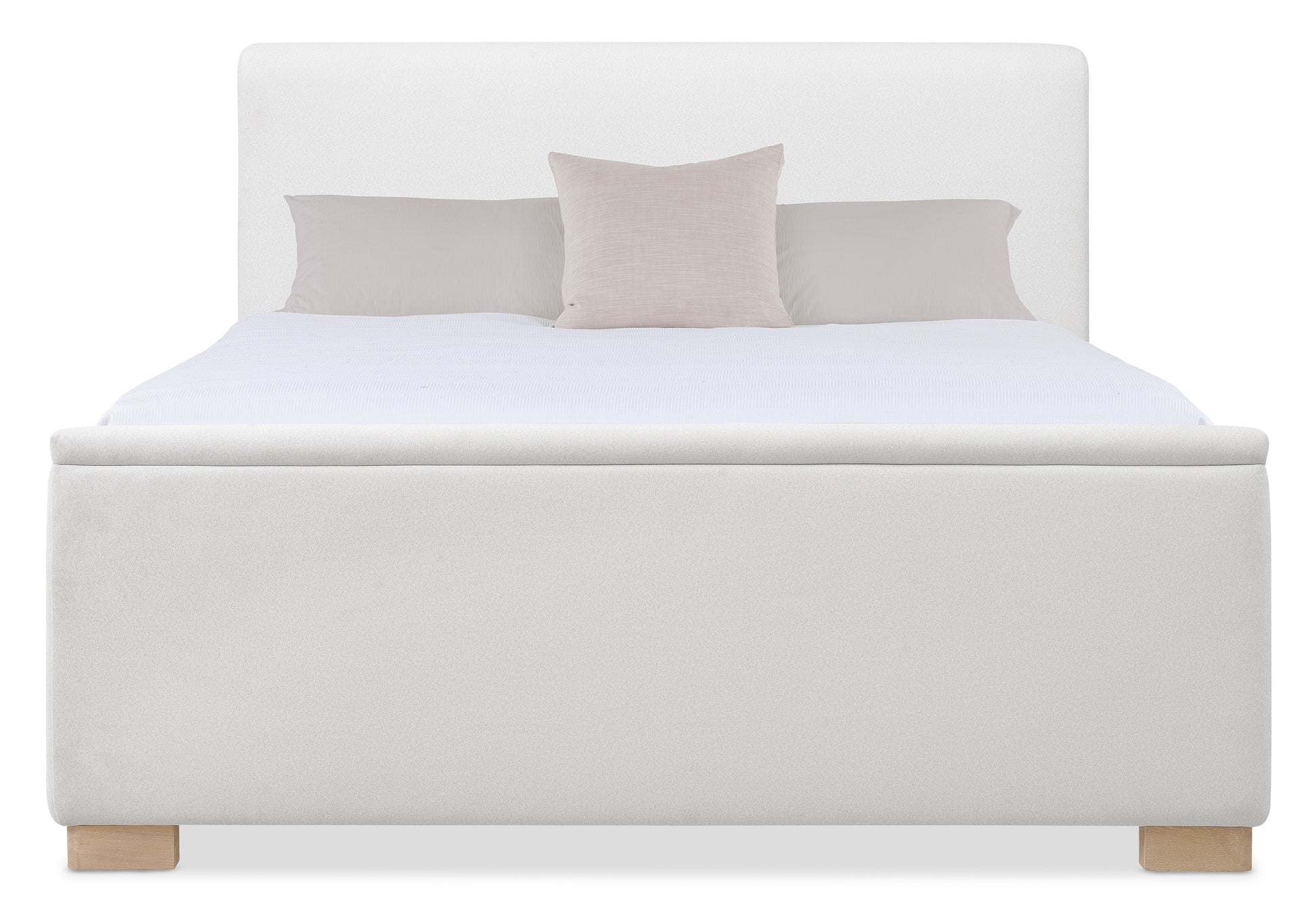 Make a bold statement with the Banyon Bay King Upholstered Bed. Upholstered in soft Merino Buff fabric, this bed offers a fully padded design with sleek wood block feet, combining comfort and contemporary style. Crafted from white oak solids and oak veneers, the light Desert Oak finish with wire-brushing and cerusing adds texture and depth to the piece. Includes a headboard, footboard, and rails to complete your modern bedroom look.