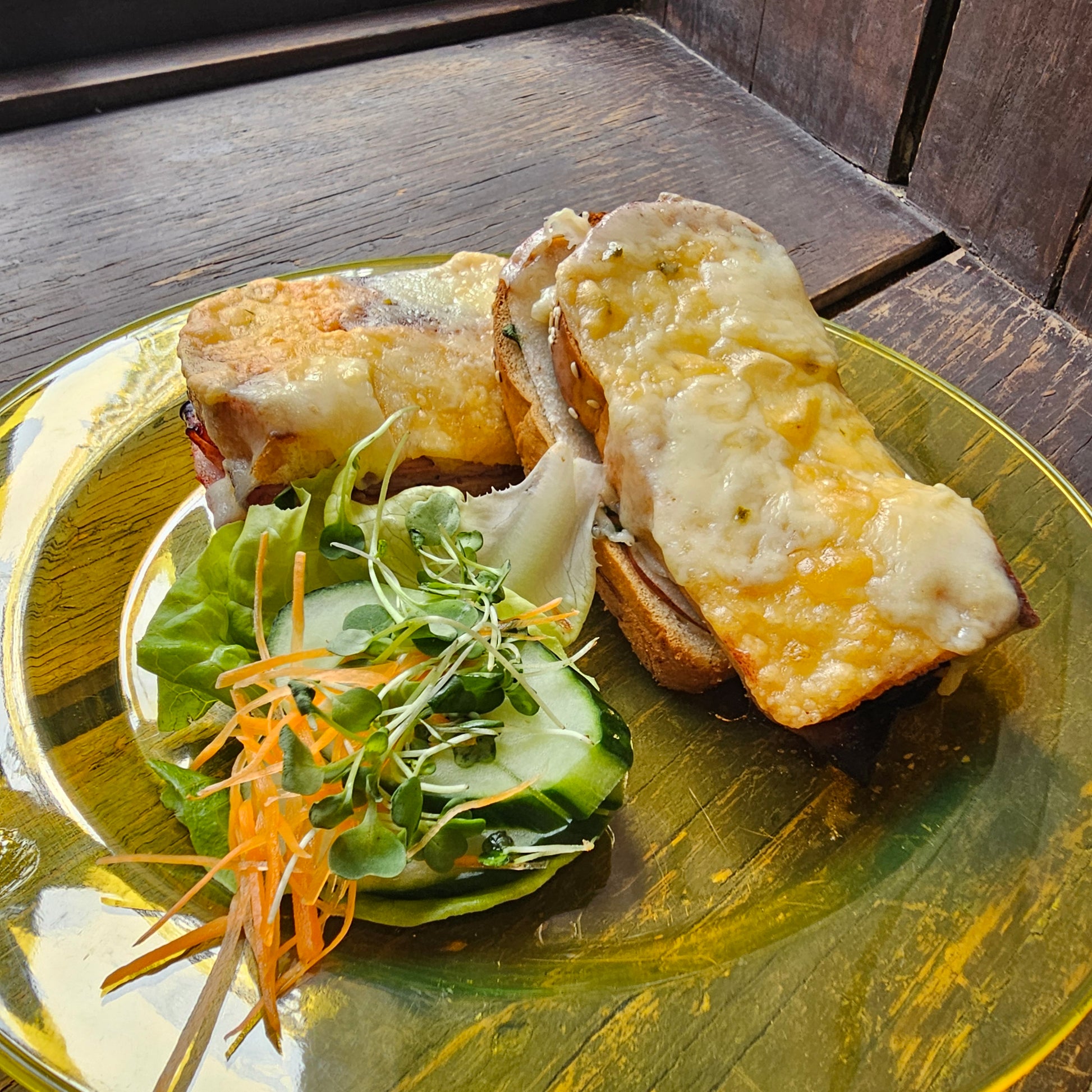 Aged blackforest ham paired with sharp cheddar, crisp romaine, and tangy mustard pickles create a sophisticated sandwich with balanced flavors and textures. Each ingredient is carefully selected to deliver a refined, satisfying bite.