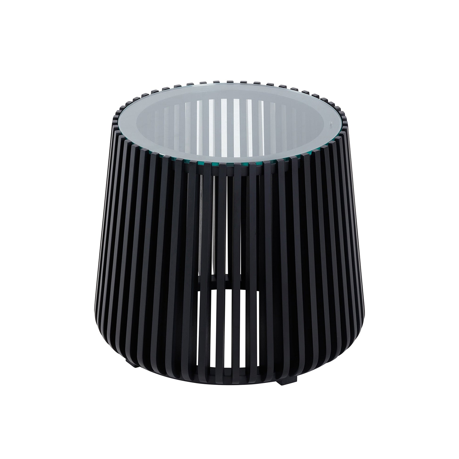 Featuring curved edges, glass tops and a moody black finish for contrast and glam. The slats and curves offer an airey yet balanced feel to a space. Pairing effortlessly with the matching coffee table.