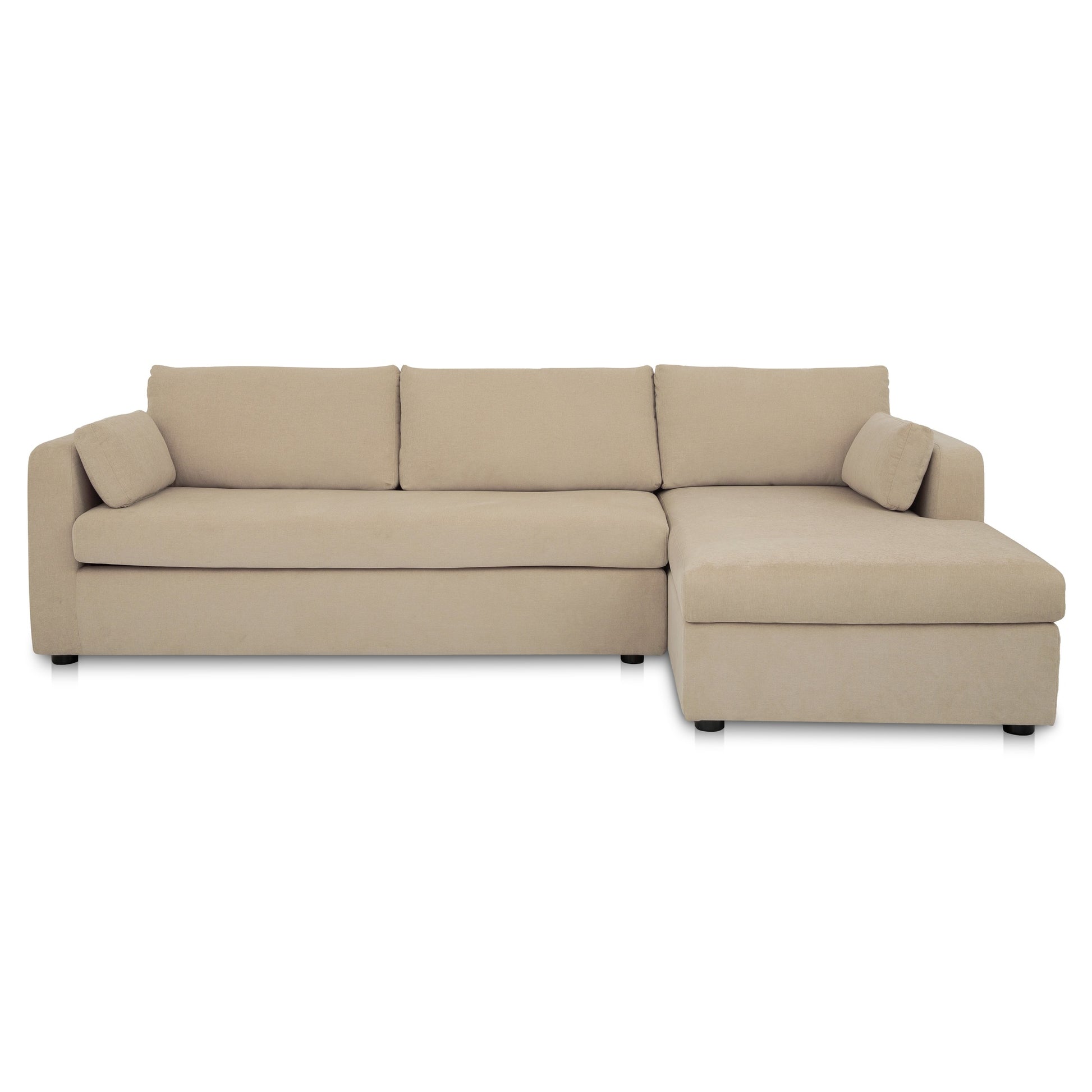 Meet the sectional that does it all. The Burrow combines streamlined design with hidden function, featuring a chaise that lifts to reveal storage and a sleeper that pulls out into a short queen mattress. Upholstered in a sand-toned recycled polyester performance blend, it’s designed for daily use with a textured hand. With softened corners and toss cushions at the arms, Burrow makes compact living feel considered and complete.