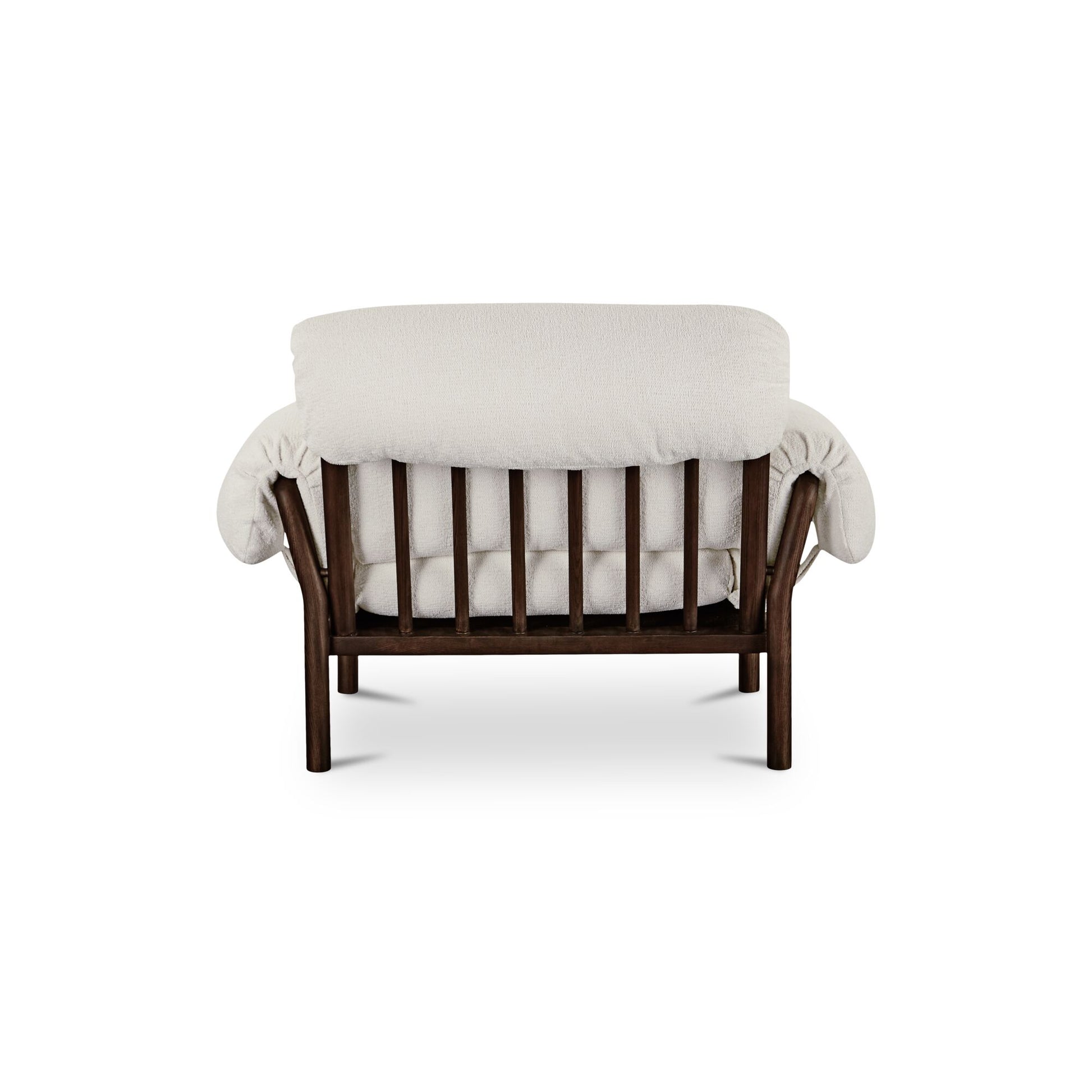 The Cardero lounge chair's solid ash frame, stained to a rich dark finish, showcases nature's artistry through intricate grain patterns. Timeless spindle back and flared wooden arms complement the generously proportioned seat and feather and fiber fill, inviting serene relaxation. Fold-over details with ruche texturing and tie detail add a touch of casual sophistication.