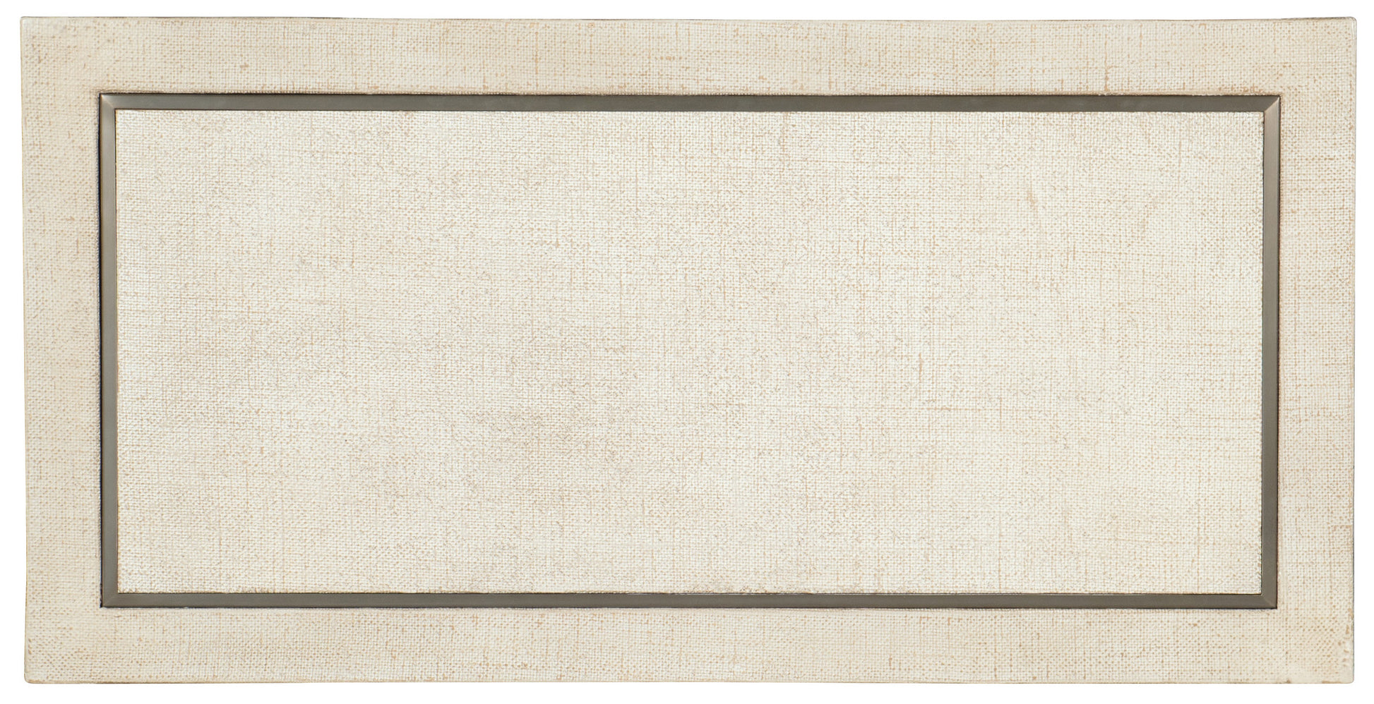 A sleek profile combines with a serene color palette in the Cascade Nightstand, offered in a lacquered burlap finish called Pebble Beach with a champagne-colored metal inlay around the top for a touch of sparkle. This airy piece offers the function of a middle and bottom shelf, one self-closing drawer and a cord clip on the back. Finished on all sides.