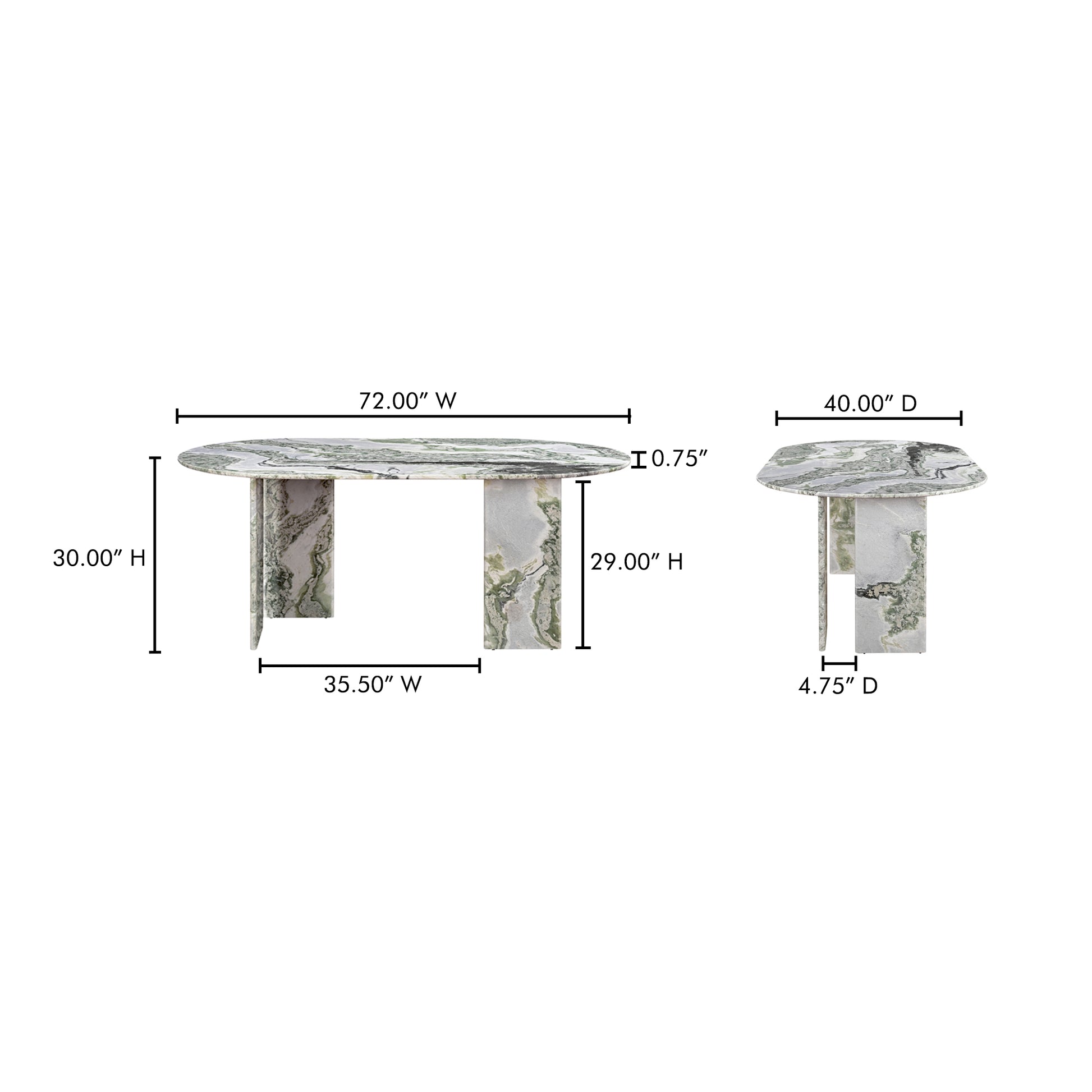 The Celia oval dining table effortlessly combines contemporary flair with a timeless silhouette. The table's allure is further enhanced by expressive green onyx marble, adding a touch of artistry and opulence. The smooth and organic textures on the marble beautifully contrast with the table's geometric base, creating an intriguing visual harmony and exuding an undeniable sense of elegance and versatility.