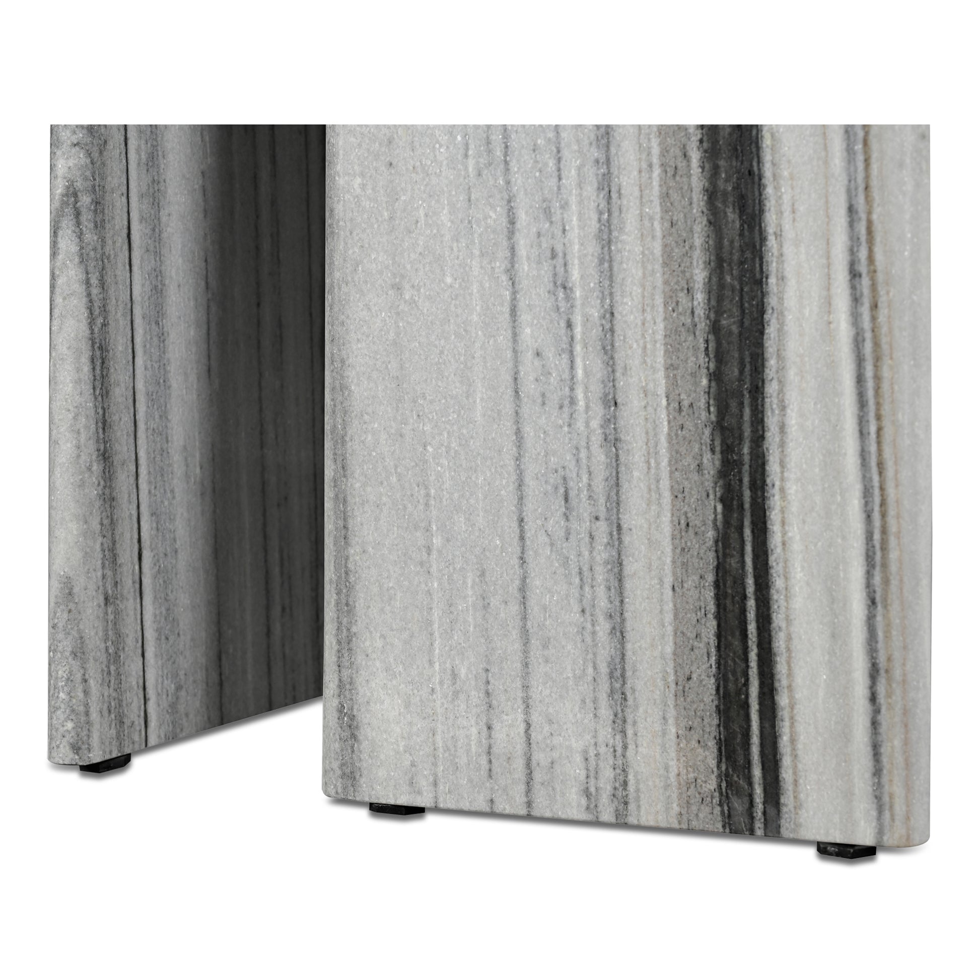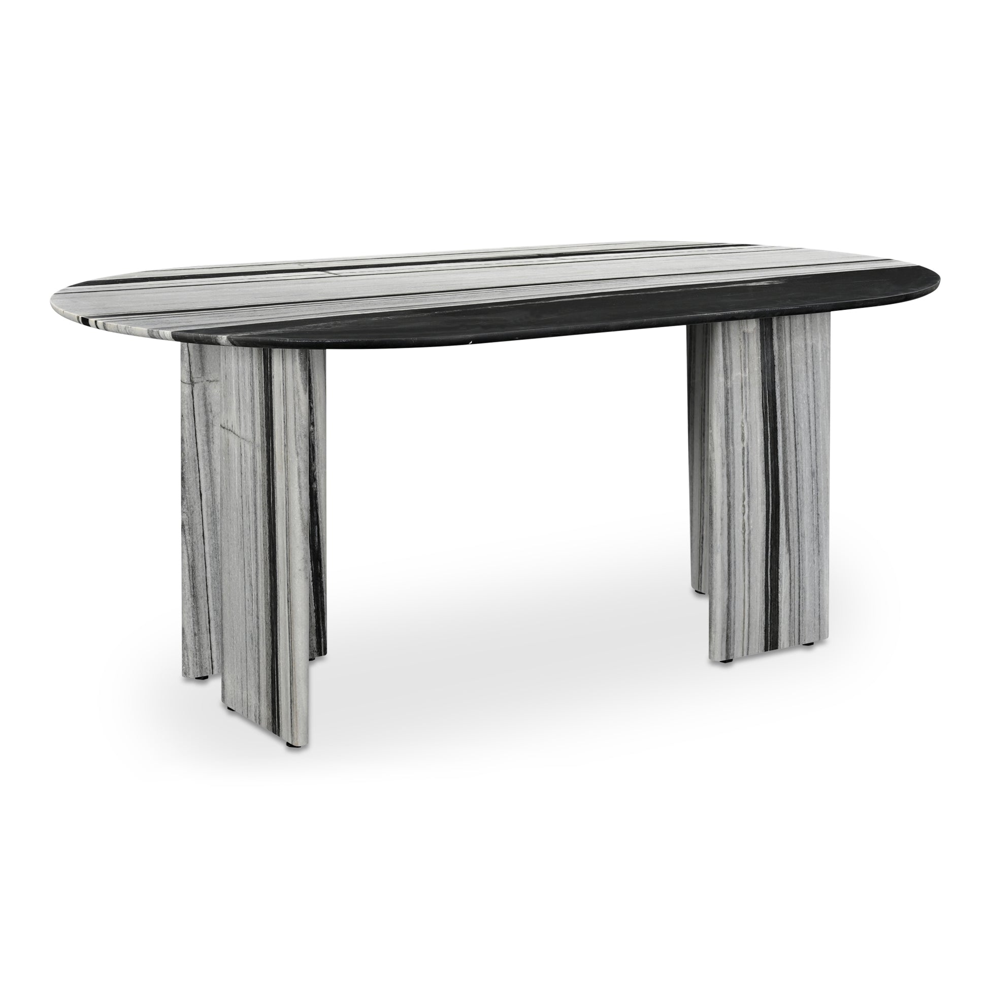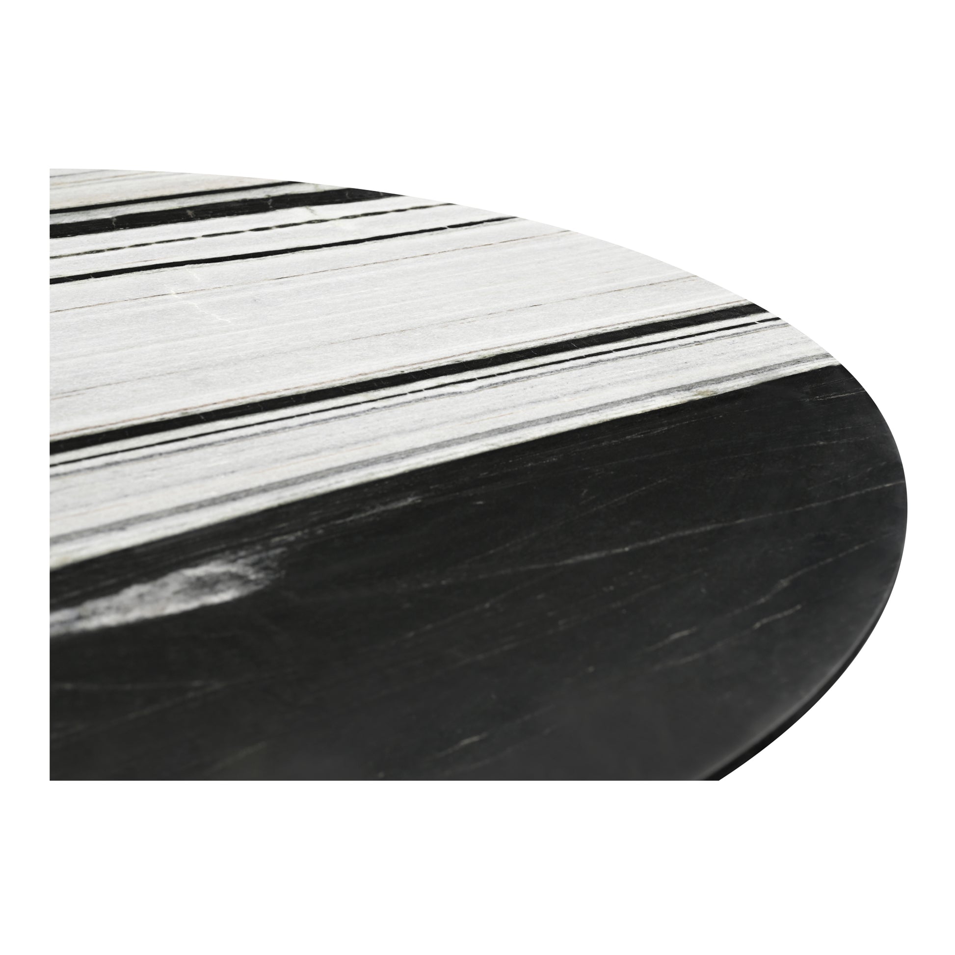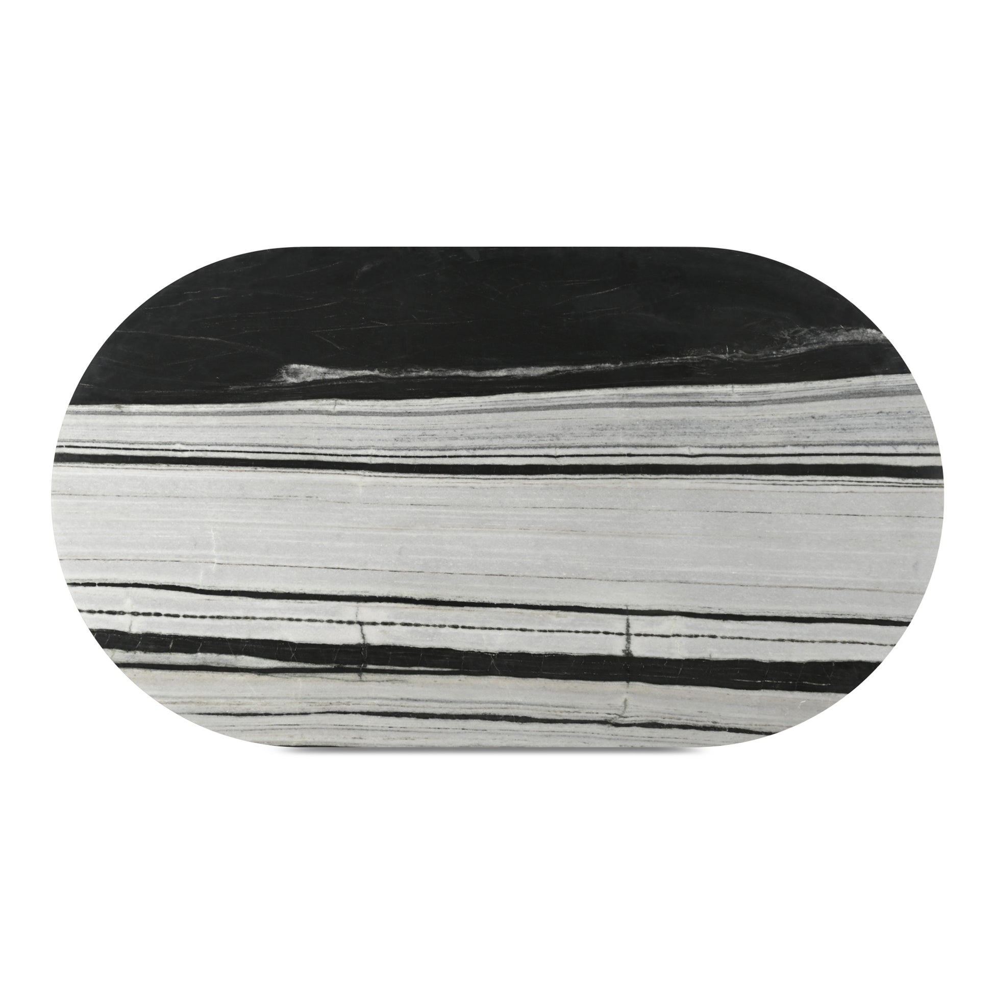 The Celia oval dining table effortlessly combines contemporary flair with a timeless silhouette. The table's allure is further enhanced by expressive panda marble, adding a touch of artistry and opulence. The smooth and organic textures on the marble beautifully contrast with the table's geometric base, creating an intriguing visual harmony and exuding an undeniable sense of elegance and versatility.