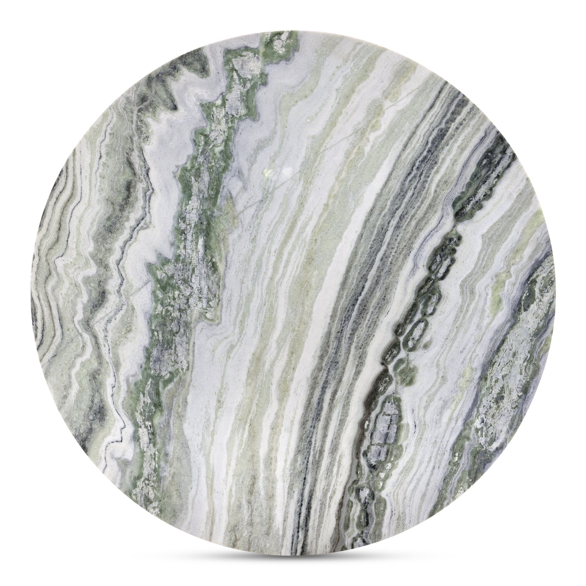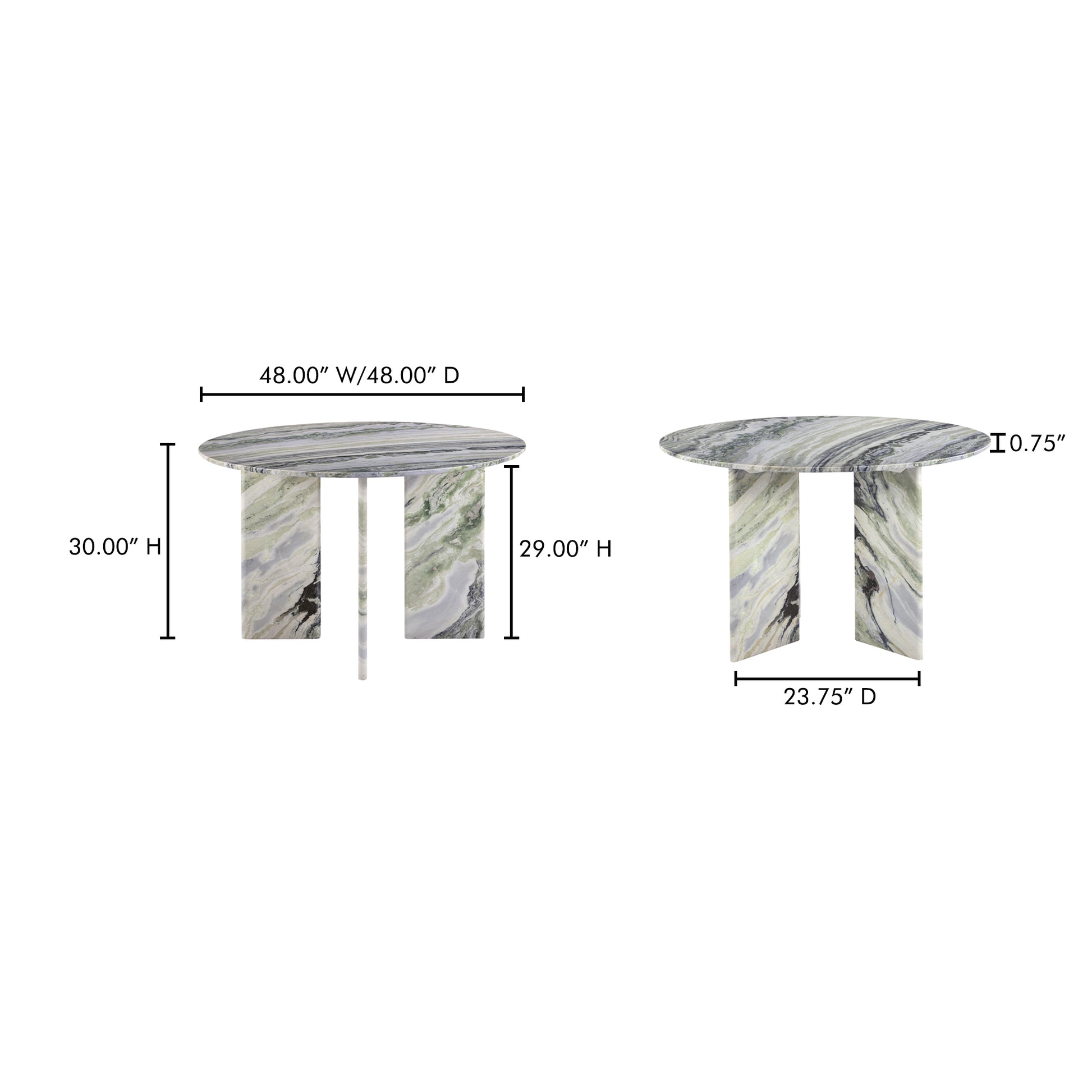 The Celia round dining table effortlessly combines contemporary flair with a timeless silhouette. The table's allure is further enhanced by expressive green onyx panda marble, adding a touch of artistry and opulence. The smooth and organic textures on the marble beautifully contrast with the table's geometric base, creating an intriguing visual harmony and exuding an undeniable sense of elegance and versatility.