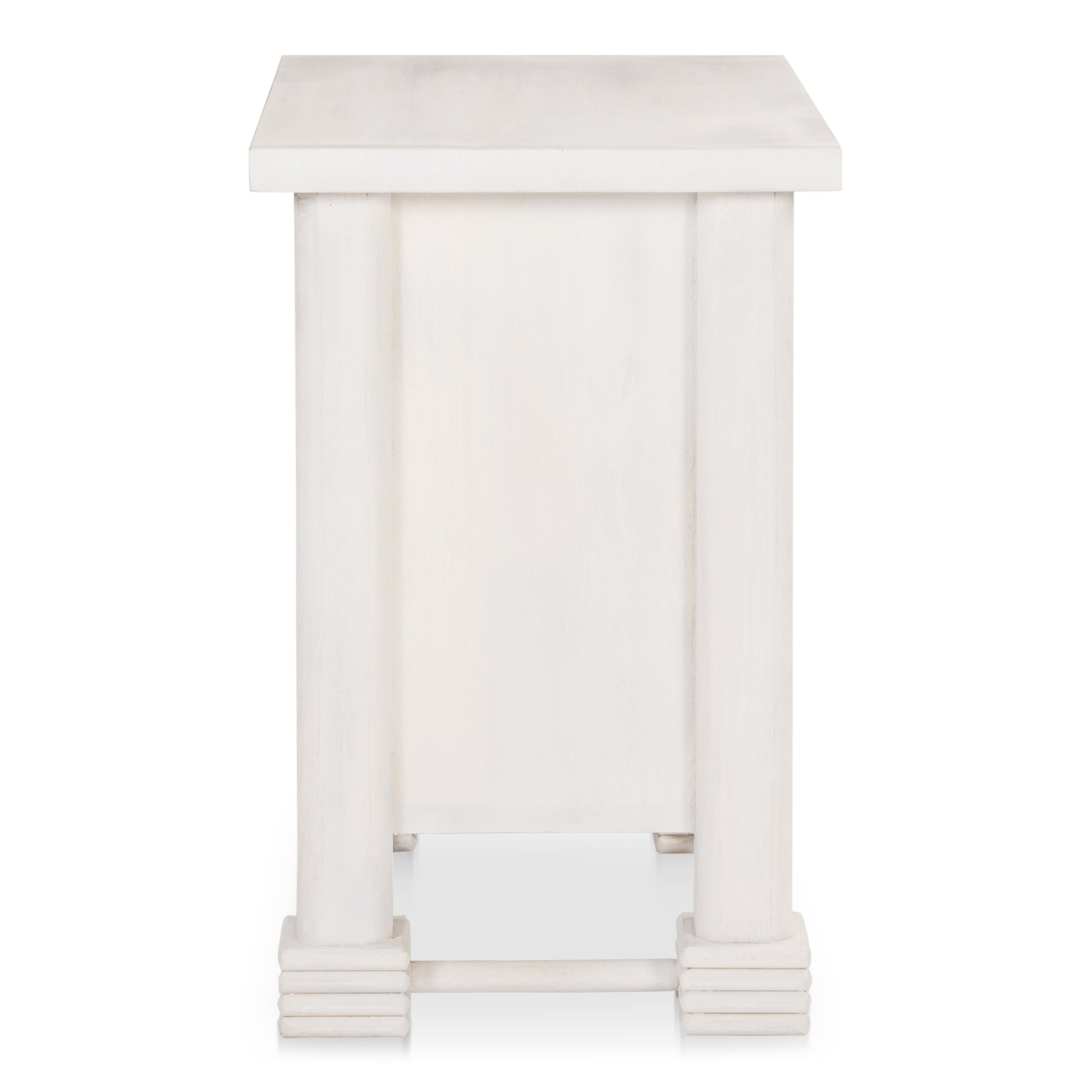 French-inspired elements and circular motifs enrich the Clement nightstand's oversized, chunky design. Crafted from mango wood with a whitewash finish, this ornate piece features carved detail feet with stretcher bars and drawer storage.