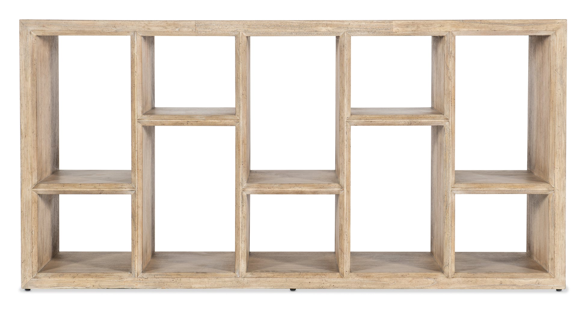 In a dynamic design creating an asymmetric assortment of cubbies, the Commerce & Market Console has five fixed shelves creating 10 storage spaces. Crafted of Mindi Solids, it has a light natural wood finish.