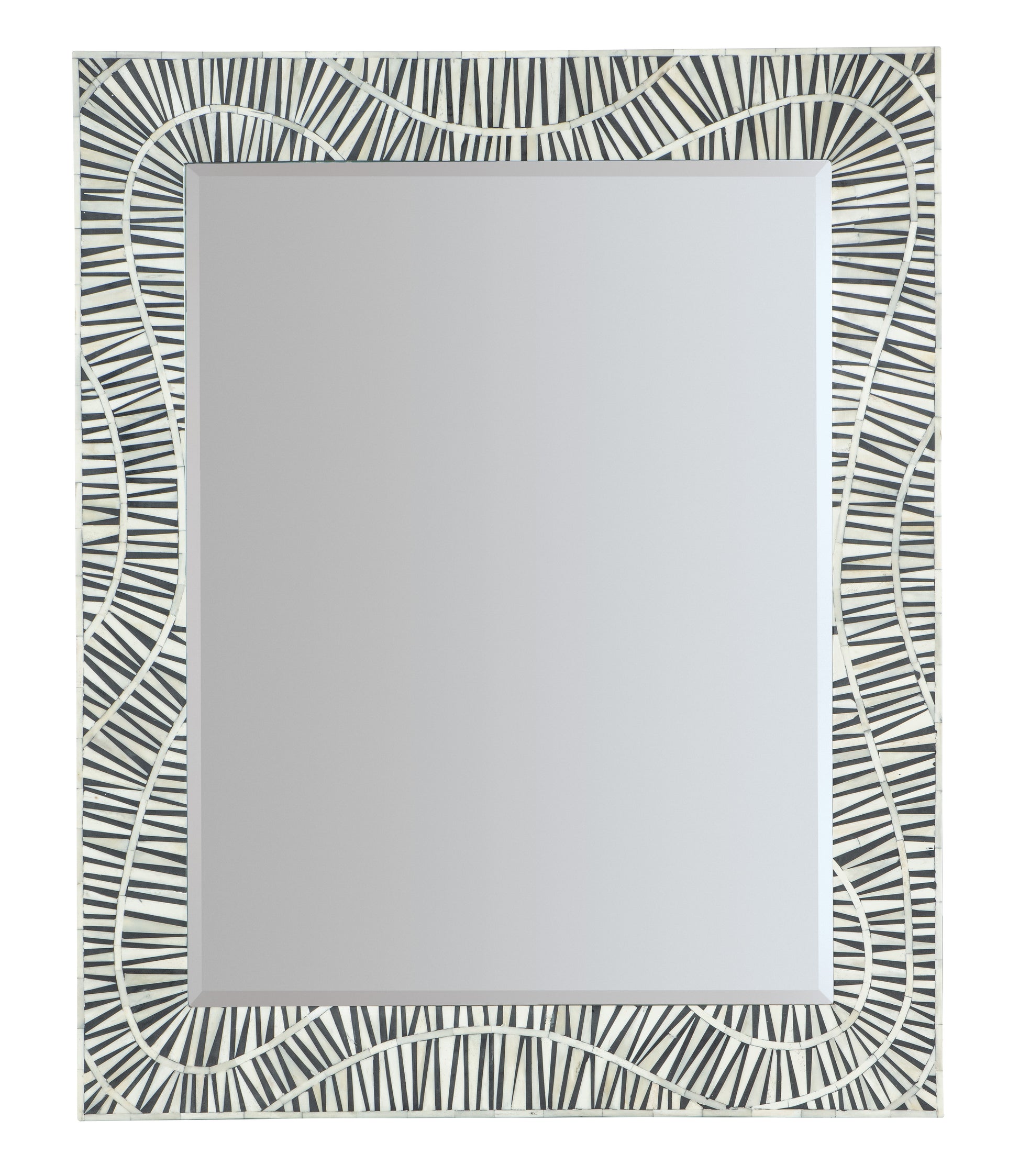 With a tribal and primitive vibe, the Tiger Tooth Beveled Vertical Mirror has a black and white design and is crafted of Mango Solids, Bone and glass. The rectangle shape allows the mirror to be hung vertically or horizontally.