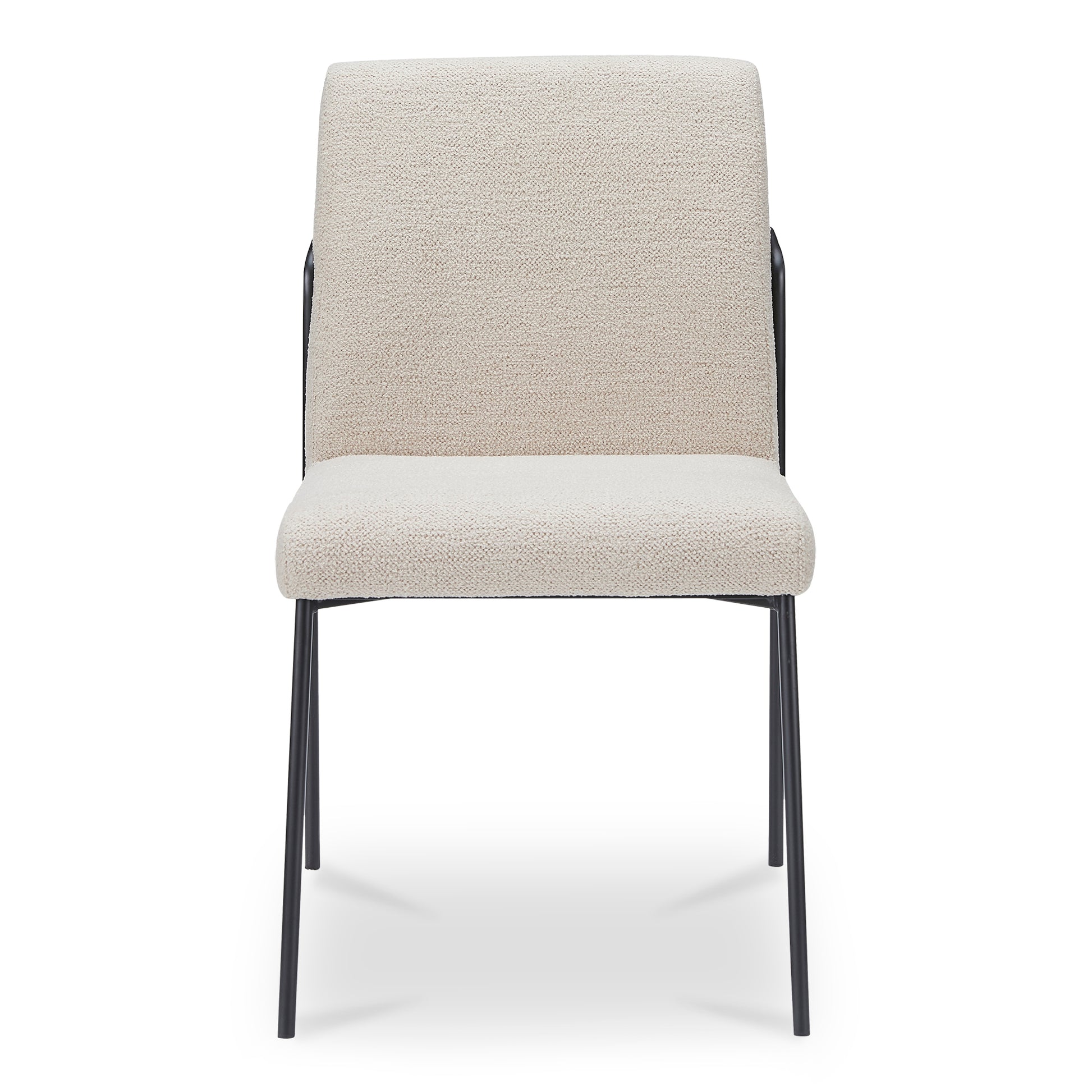 The Danny dining chair marries visual lightness with sumptuous comfort. A slim metal frame curves gracefully, supporting plush ivory upholstery. The minimalist base imparts an ethereal quality, contrasting beautifully with the padded seat and back.