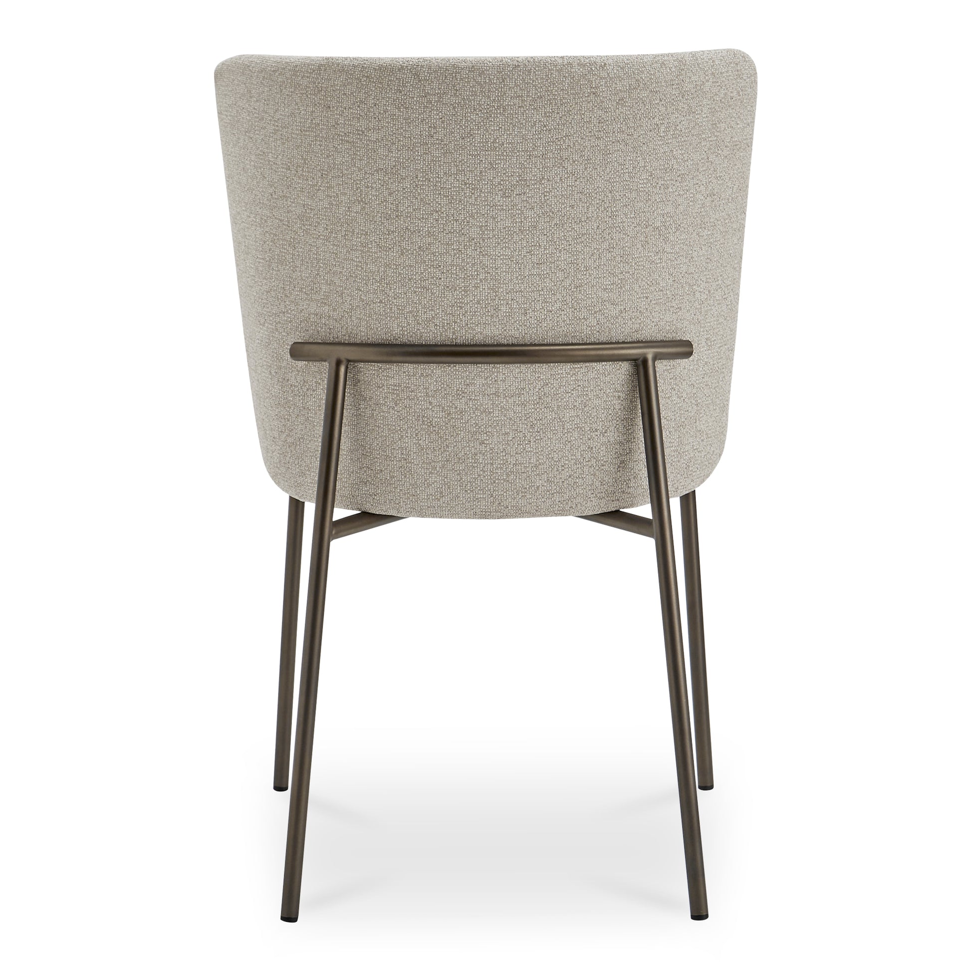 The Early dining chair is an elegant fusion of minimalist design and comfort that features a slim metal frame in a blackened bronze finish. Its seat and comfortably curved back are upholstered in durable, easy-to-maintain Performance fabric. It complements any dining setting, especially alongside wooden tables, presenting a clean, cohesive look that invites sophisticated ease.