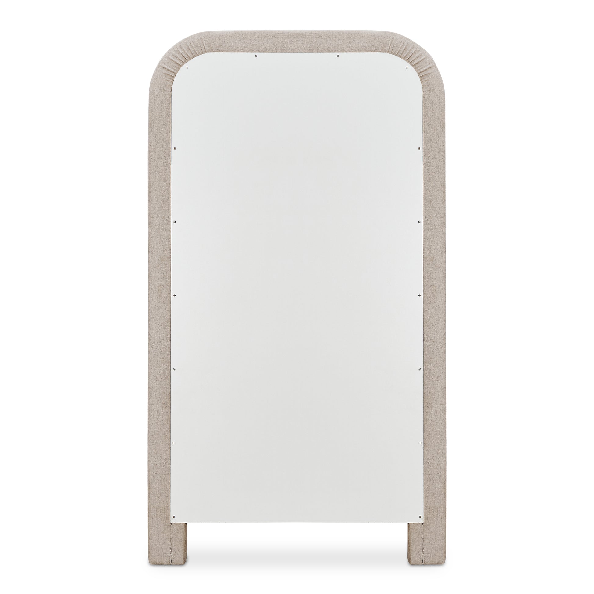 The Ellison mirror's clean lines and gently rounded silhouette are enhanced by meticulously ruched corners and sumptuous fabric upholstery. Generous proportions punctuate this understated piece.