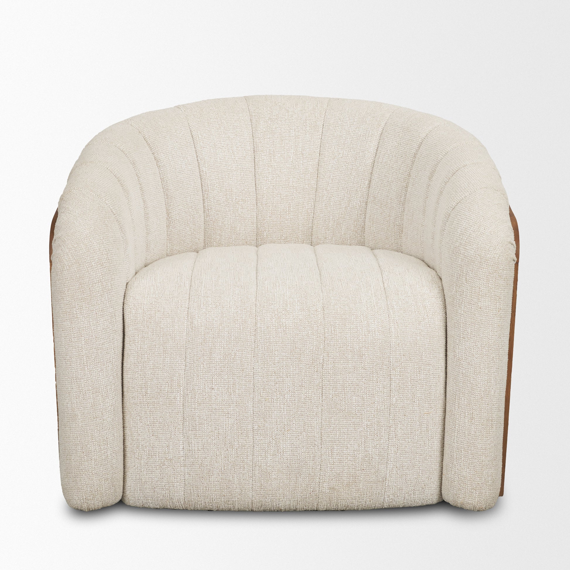 The Fonda Swivel is a barrel-style swivel accent chair upholstered in cream fabric with a wide-channel seashell design. A textured natural jute back adds organic contrast to its elegant silhouette.