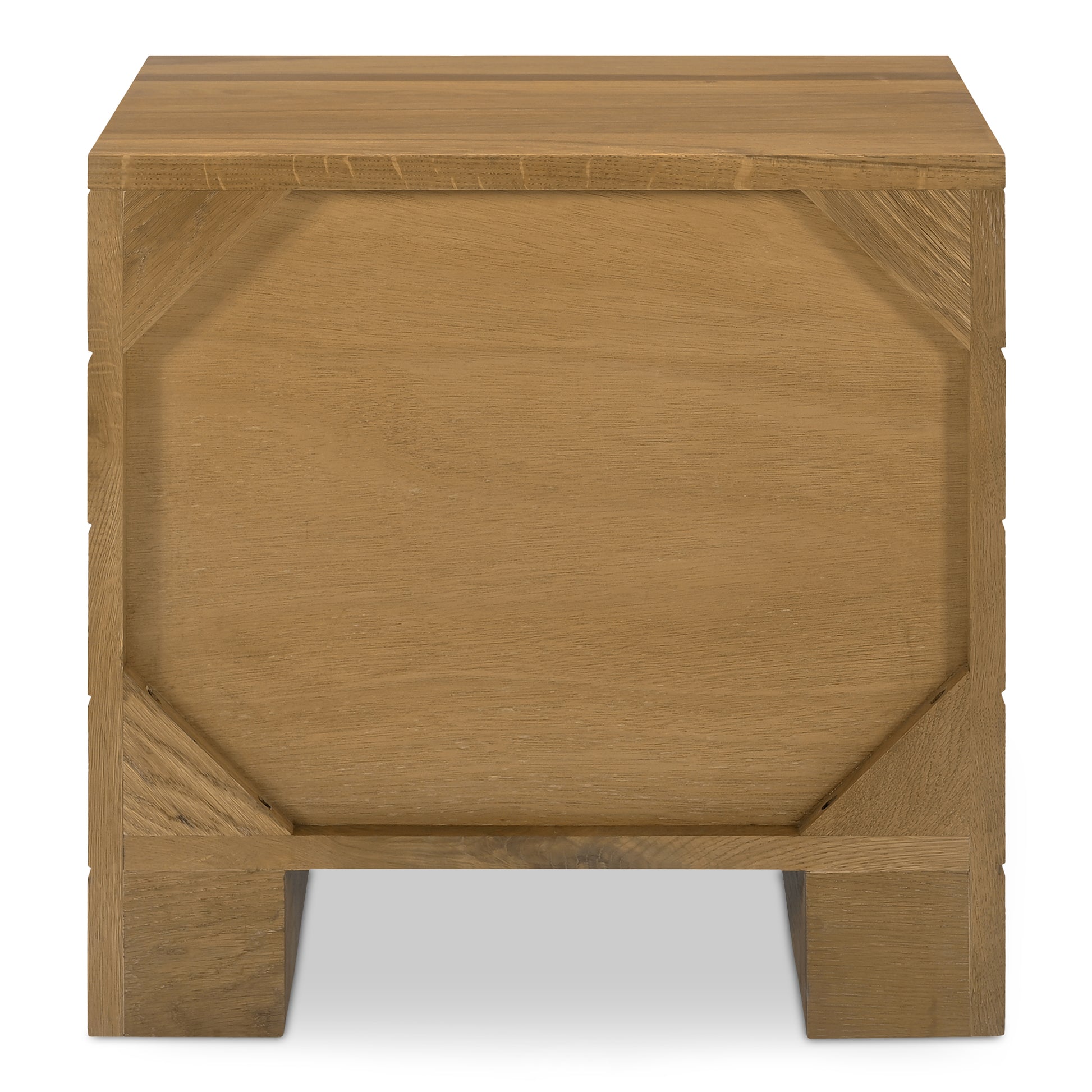 The nightstand’s striking geometry brings out the oak wood's mid-tone brown finish to blend seamlessly into various interiors with its subtle sophistication. This piece features a unique geometric arrangement with a top drawer composed of a single geometric row and a larger drawer comprised of three geometric rows beneath while maintaining a light, unbulky feel.