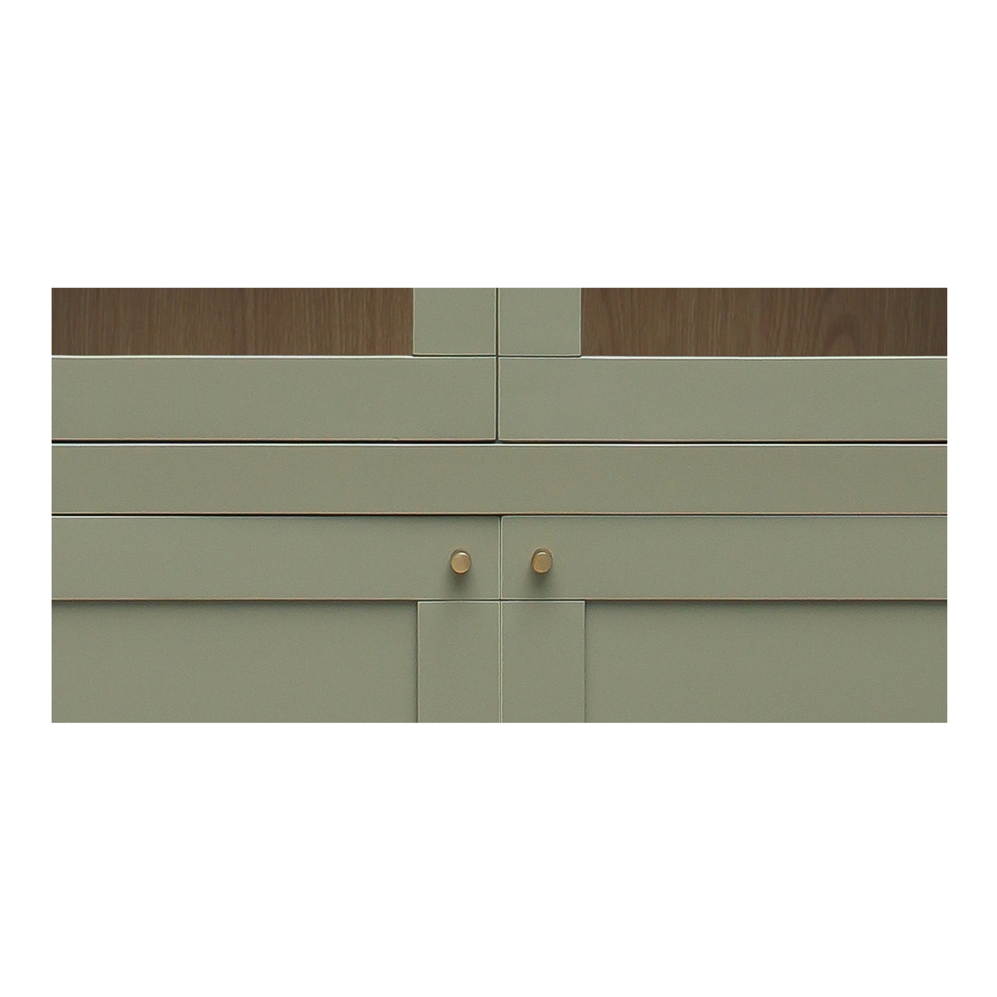 • Door front panels are a balance between transparent and concealed storage. Dowel legs and simple bronze hardware add softness