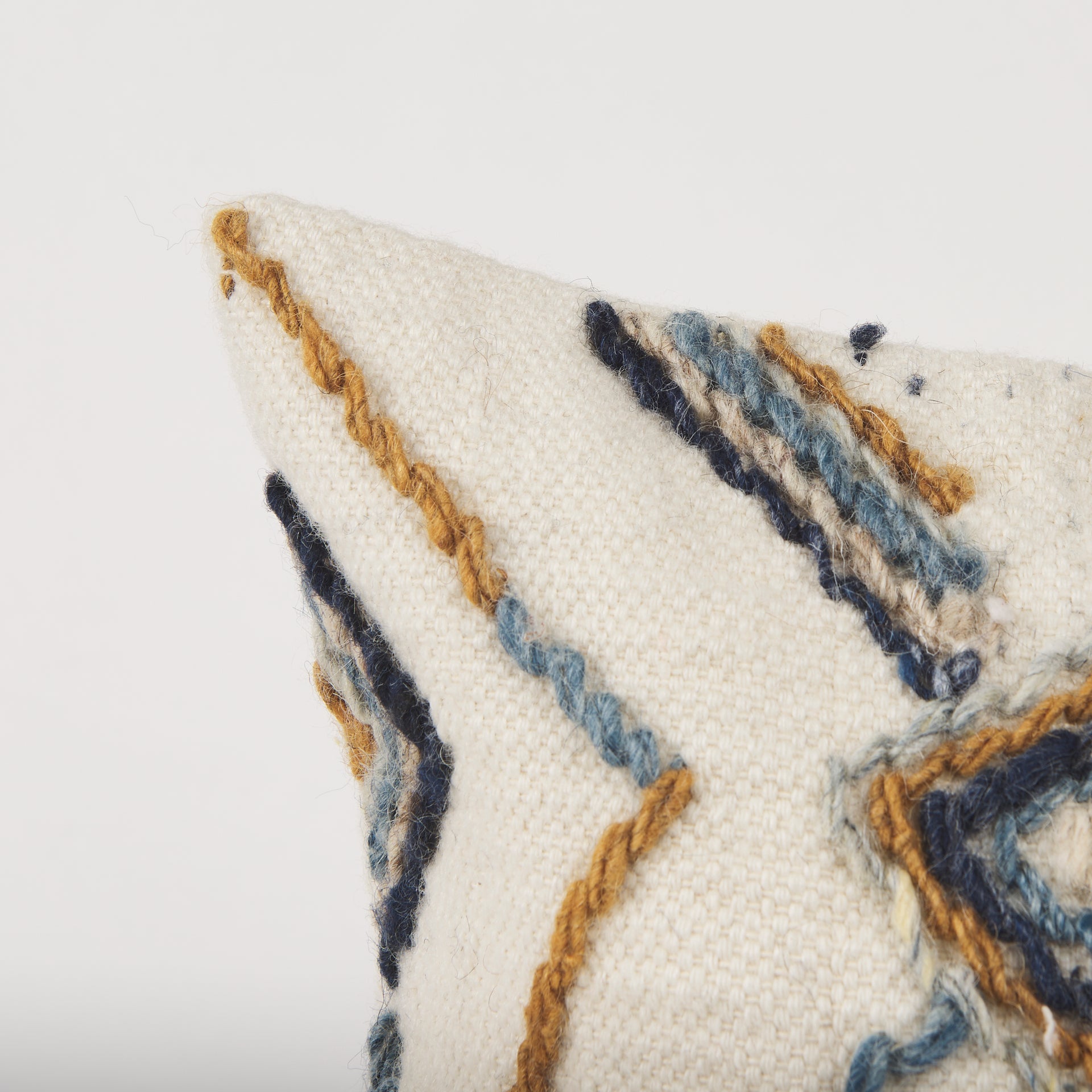 The decorative lumbar Kitt Pillow Cover is handwoven cream wool that has been beautifully embroided. Striking blues, yellow, and black come together to form a visually intriguing geometric pattern. Not only does this decorative pillow cover add visual interest, but also provides great texture. Use alone or pair with other neutral colors for a layered look. Pillow inserts sold separately.