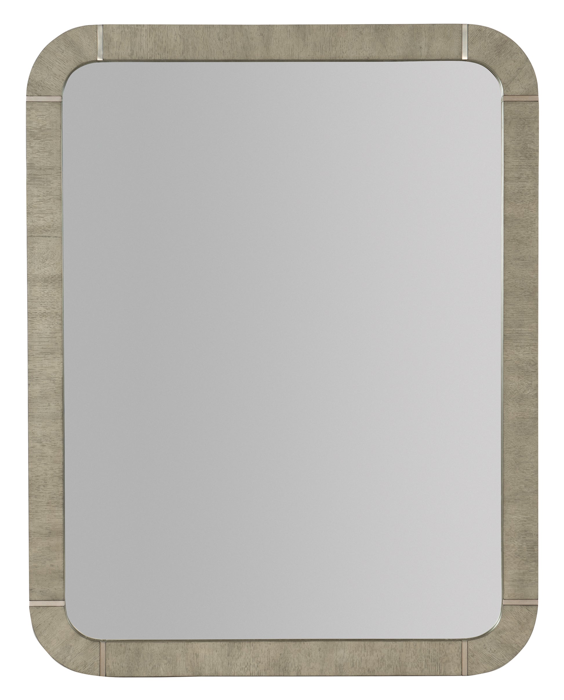 With a rustic weathered finish and clean modern lines, the striking Pinnacle Trails Mirror is crafted of Oak Veneers in a soft smoked gray Mink finish with metal accents.