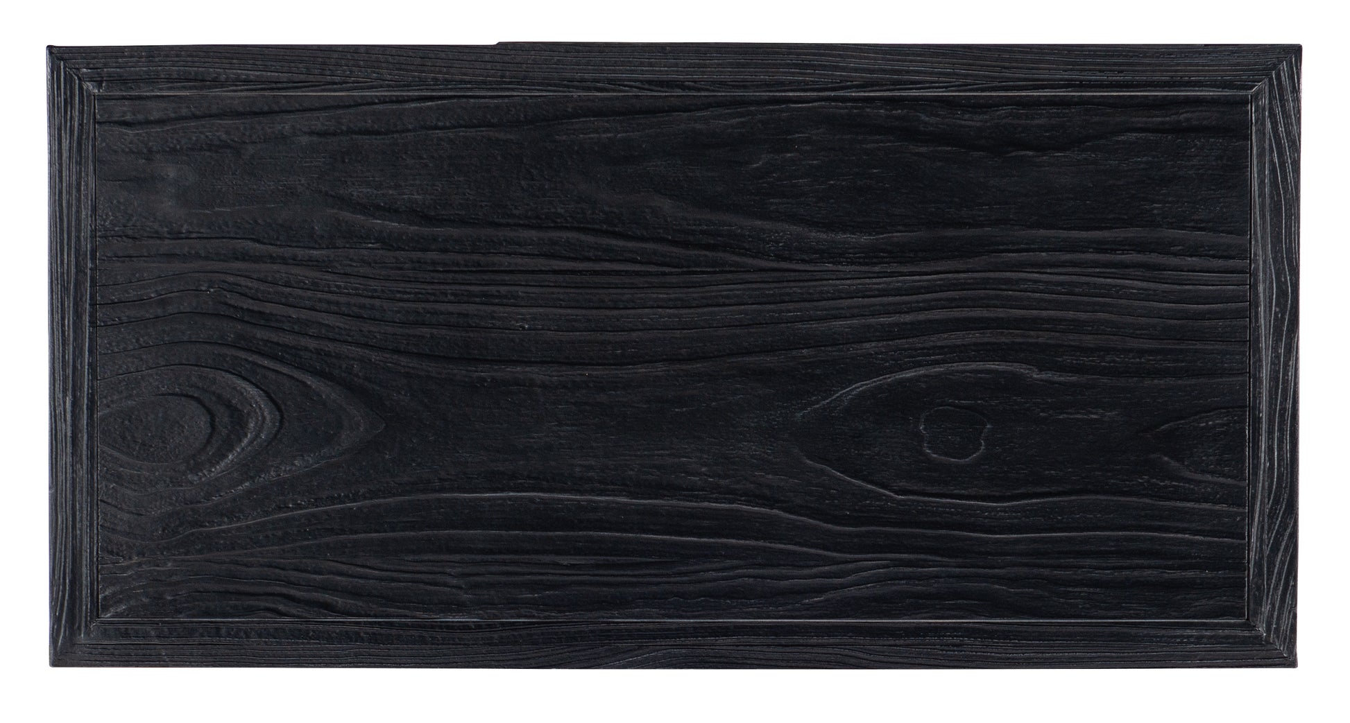 With the aura of a rustic mountain cottage, the Linville Falls Two-Drawer Nightstand has an airy feel with an open area at the top and two self-closing drawers. Crafted of Pine Veneers, the nightstand is finished in Shadow, a charred black finish achieved through Shou Sugi Ban, a Japanese technique that creates a look resembling burnt wood. Textured metal bar pulls in an antique pewter finish add an organic accent. Functional features include a double USB charging port and a cord clip on the back.