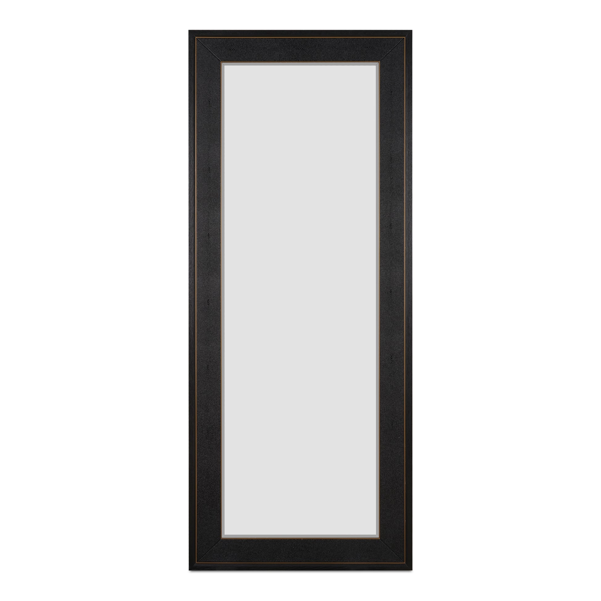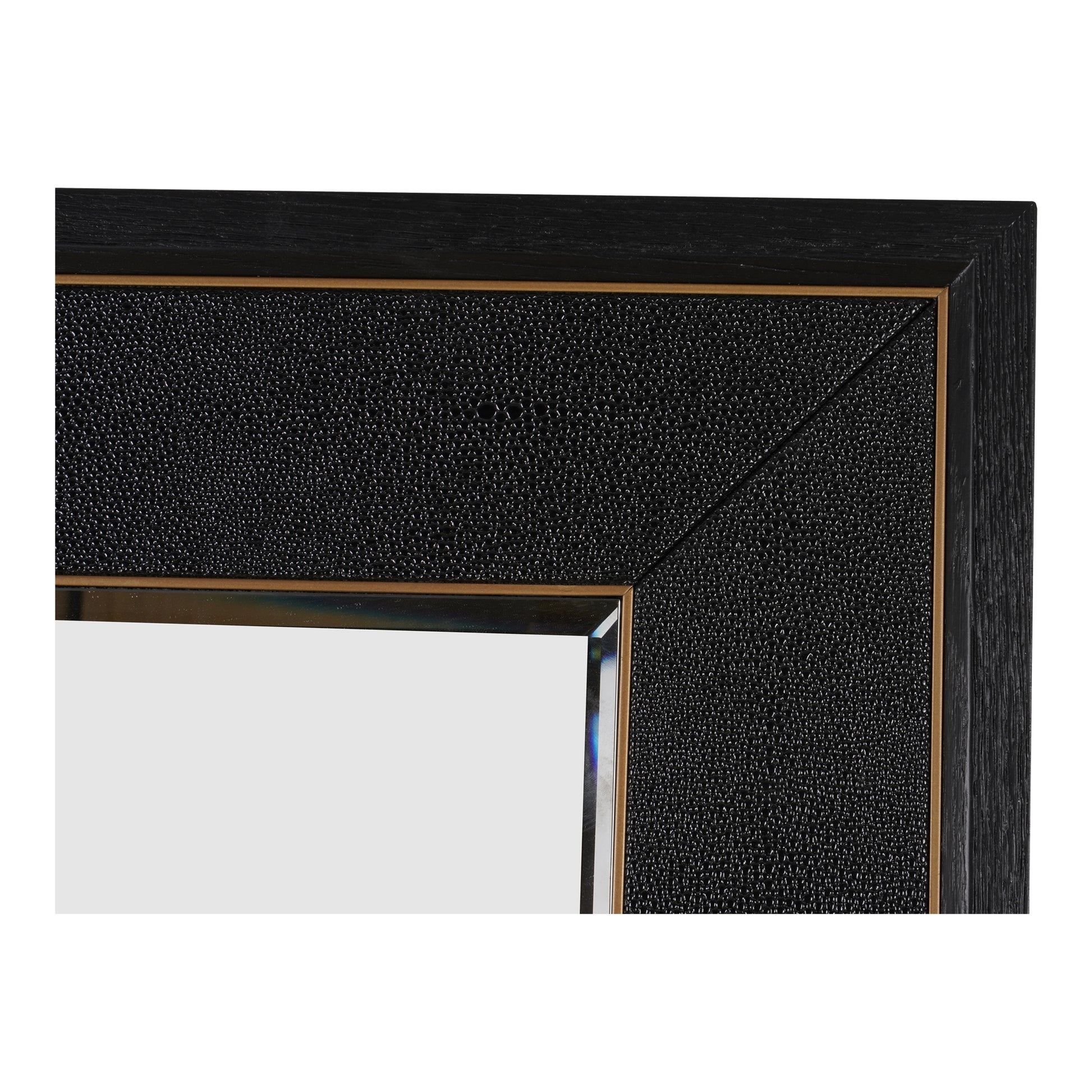 With each item upholstered in the highest quality vegan leather shagreen, the Mako collection brings effortless style, visual texture and substance to your living space. A reflection of good things to come, this contemporary modern mirror features a black oak frame with gold trim around the edges.