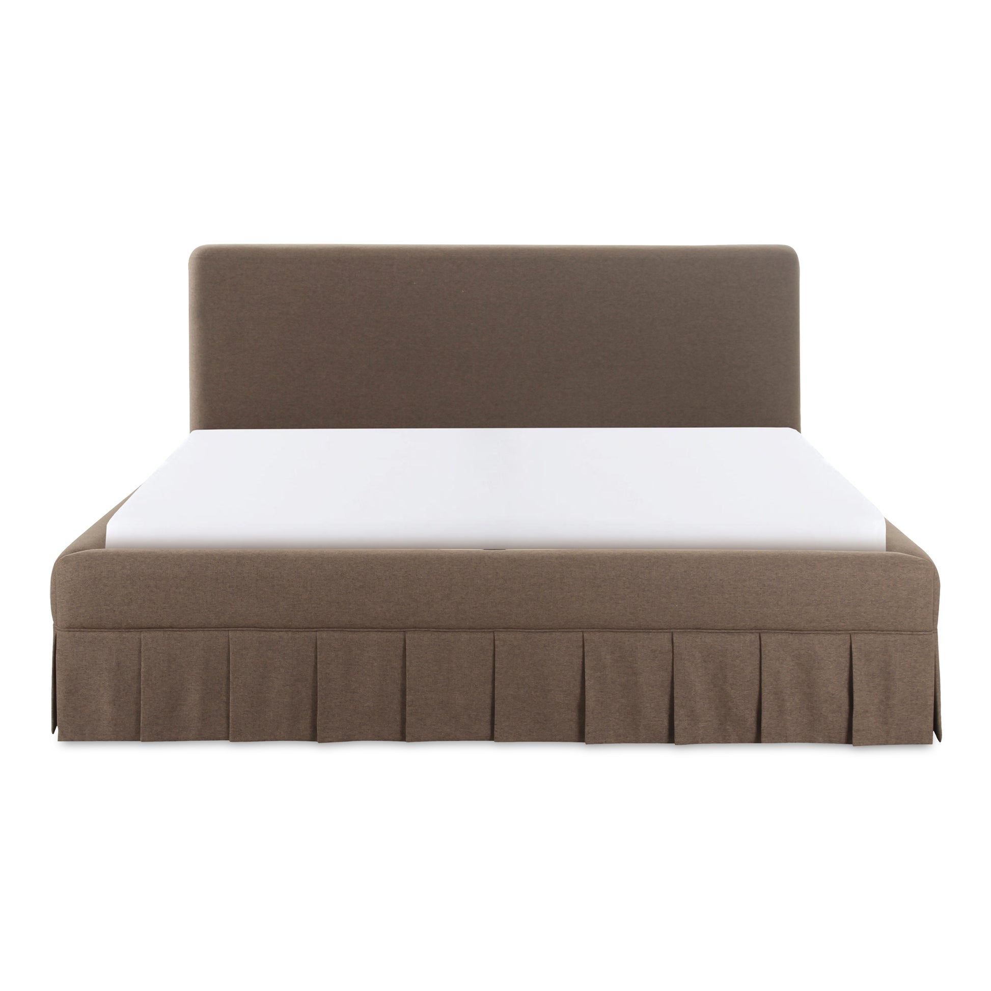 The Maren queen bed exudes a soft, feminine aesthetic, upholstered in a warm, neutral fabric and featuring a playful yet refined box pleat base reminiscent of vintage finesse, straddling the line between contemporary form and traditional finish. With smoothly rounded corners and graceful, curving forms adding softness to the design, this piece is a study in elegance and subtlety.