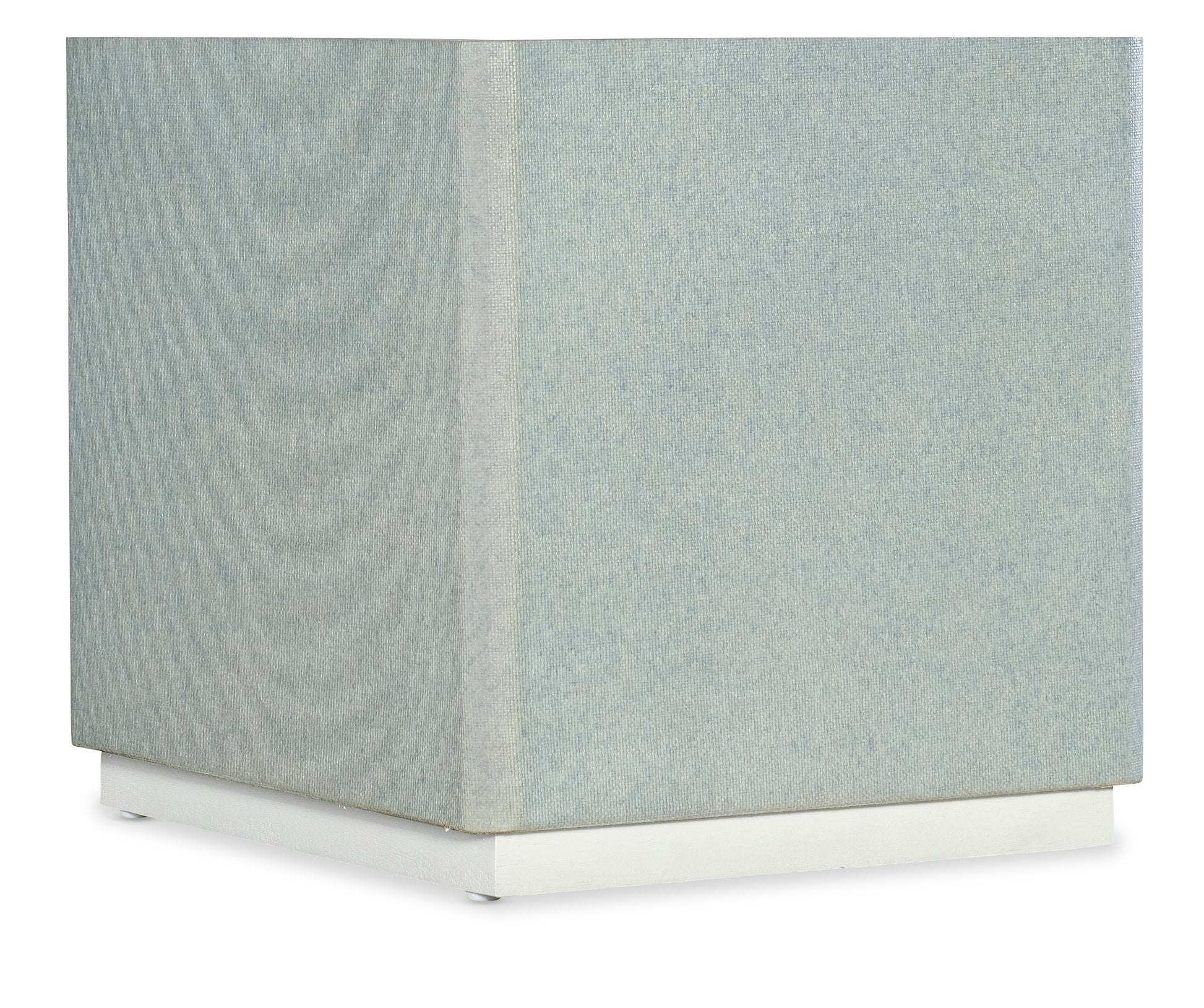 Serene and stylish with a spa-like color scheme, the modern rectangle-shaped Atlantis End Table has rounded corners, a painted tempered glass top, raffia-wrapped exterior and white plinth base. The top is painted in a creamy white, and the raffia wrap is in a pale blue tone inspired by Caribbean beaches.