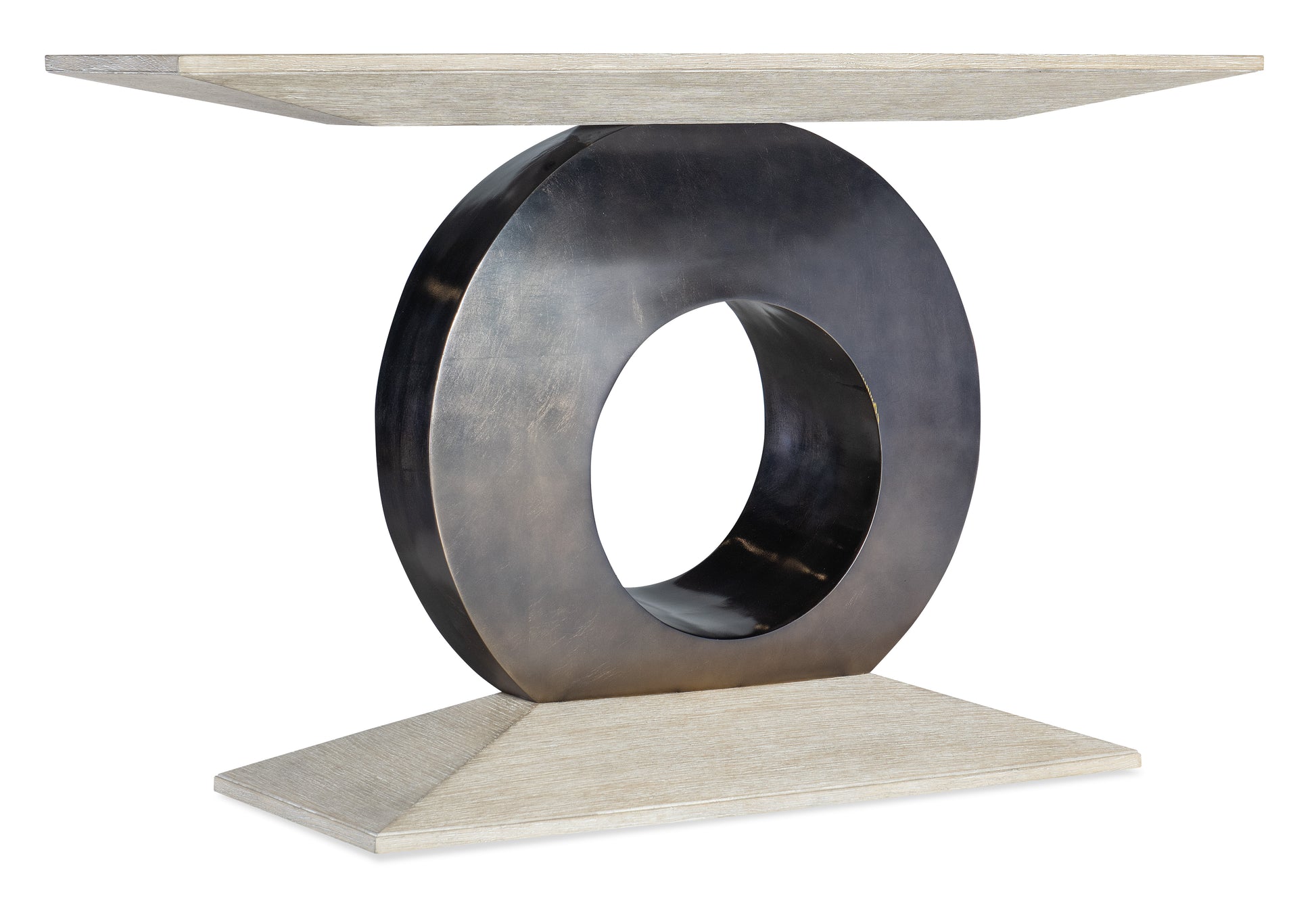 Bold, organic and geometric, the Modern Mood Accent Table has a rectangular shape with a dramatic metal-wrapped circle base. Crafted of Quartered Oak Veneers and resin, it is finished in Diamond, featuring wire-brush detailing with crystal-like alabaster and pewter hues for a soft sophistication.