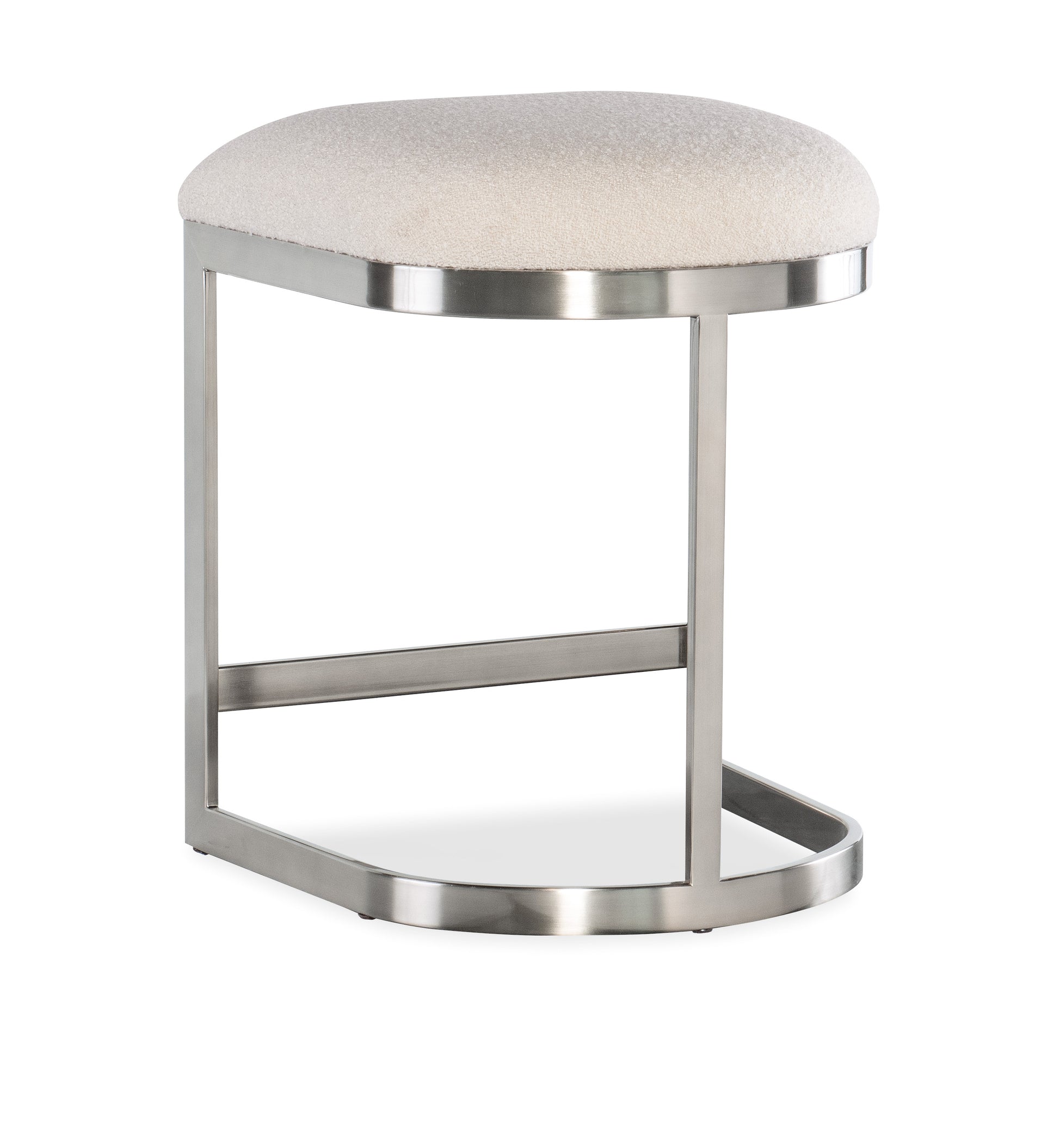 Cozy chic meets sleek sophistication with the Modern Mood Counter Stool in a backless design. The tactile and textural Boucle fabric in Inverness Natural on the U-shaped upholstered seat contrasts with a brushed metal base, stretcher and foot rail in a warm pewter finish. Fully upholstered seat.