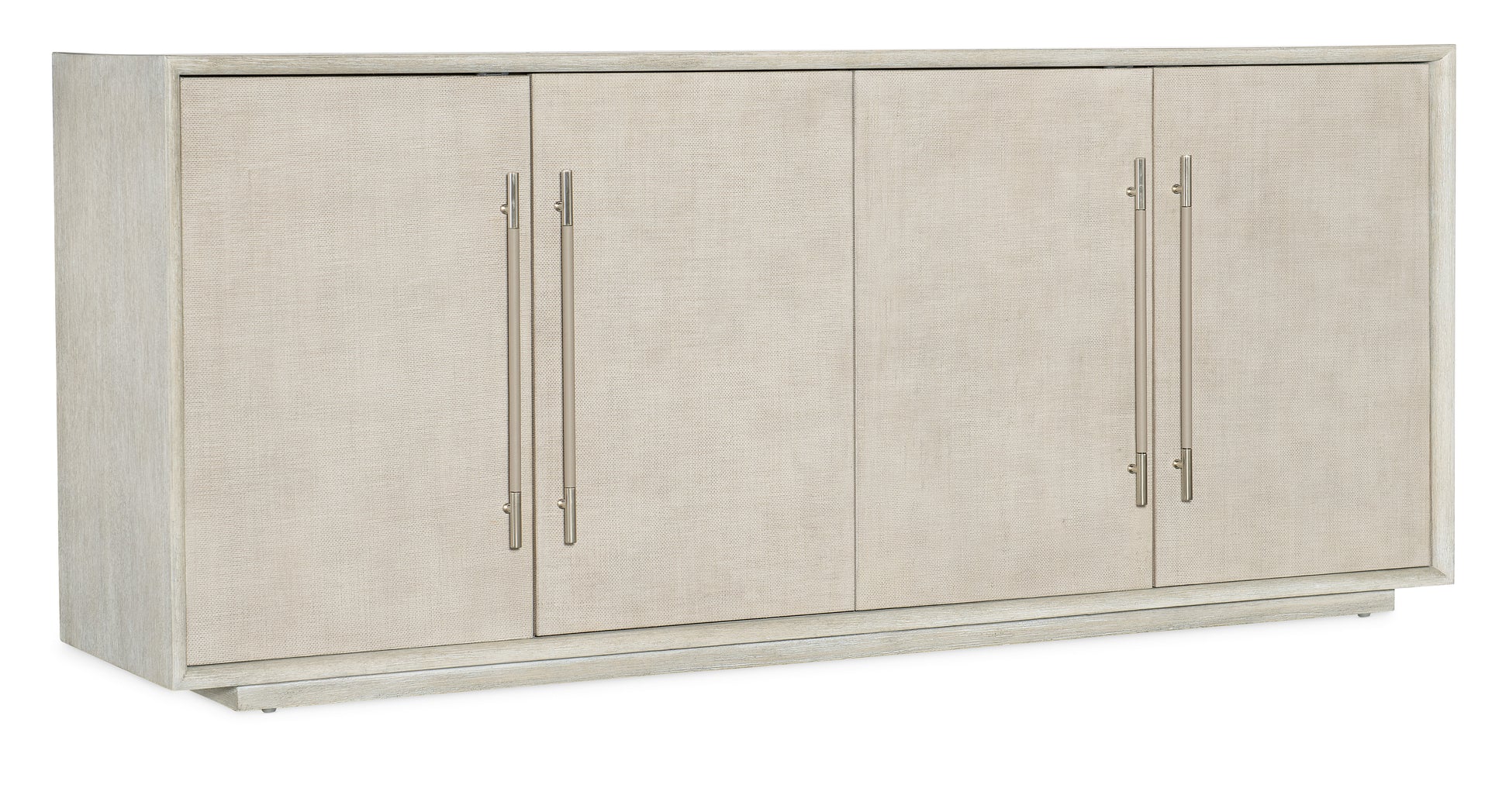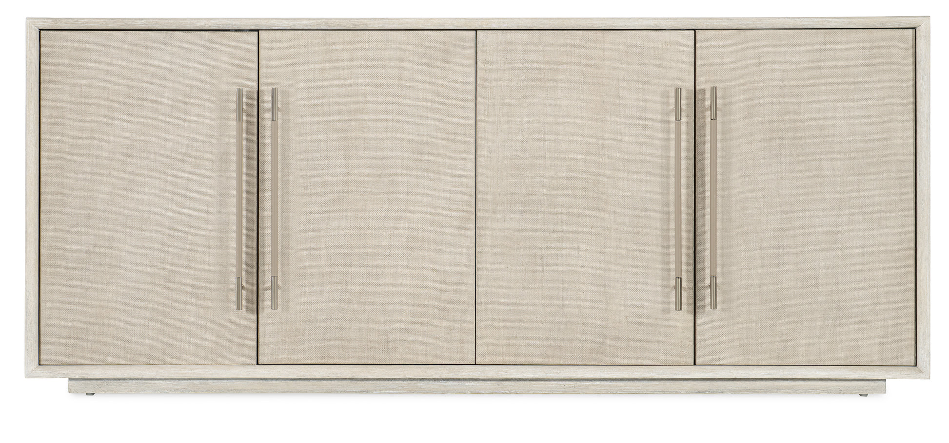 Sleek and stunning with a timeless sophistication and soft modern aesthetic, the Modern Mood Entertainment Console combines Quartered Oak Veneers with raffia-wrapped doors, warm pewter brushed metal bar pulls and leather accents. The Diamond Finish has crystal-like alabaster and pewter hues, offering a serene style. Features include four doors with soft-close hinges and magnetic catches, two adjustable wood shelves behind each pair of doors, ventilated back panels and wire management holes in the back panel and a three-plug electrical outlet behind the right-side doors.