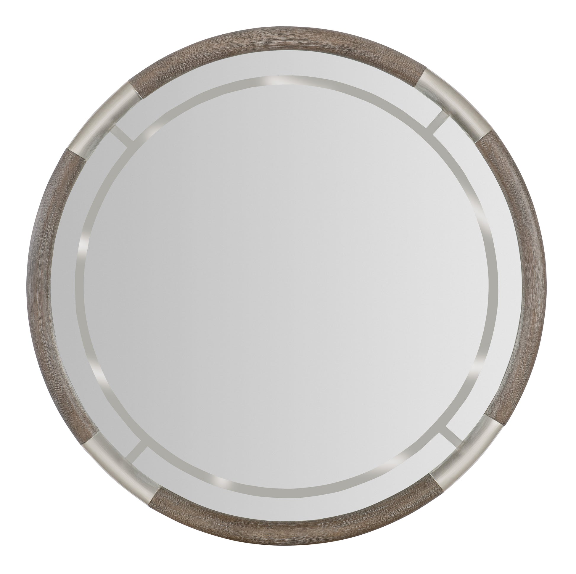 In a timeless compass-like profile, the Modern Mood Round Mirror combines Quartered Oak Veneers in the Mink finish with wire-brush detailing and warm pewter metal accents for a striking focal-point piece.