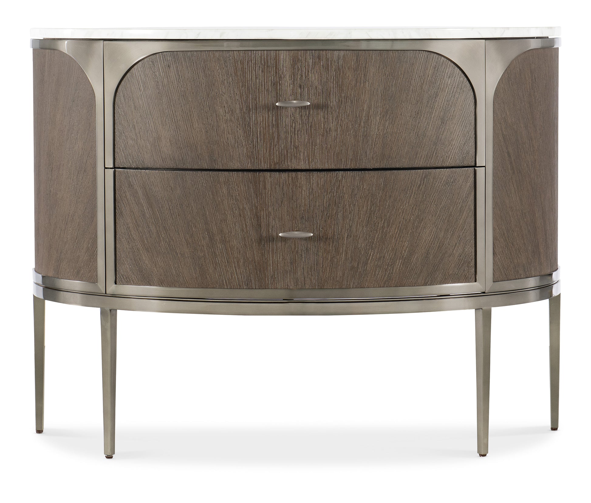 Architectural and timeless with a luxe mixture of materials, the Modern Mood Nightstand is a statement piece. Featuring a demilune shape and two self-closing drawers, the nightstand has a metal frame, legs and slender pulls and a white and gray marble top. The case is crafted of Oak Veneers and finished in the dark Mink color with wire-brush detailing.
