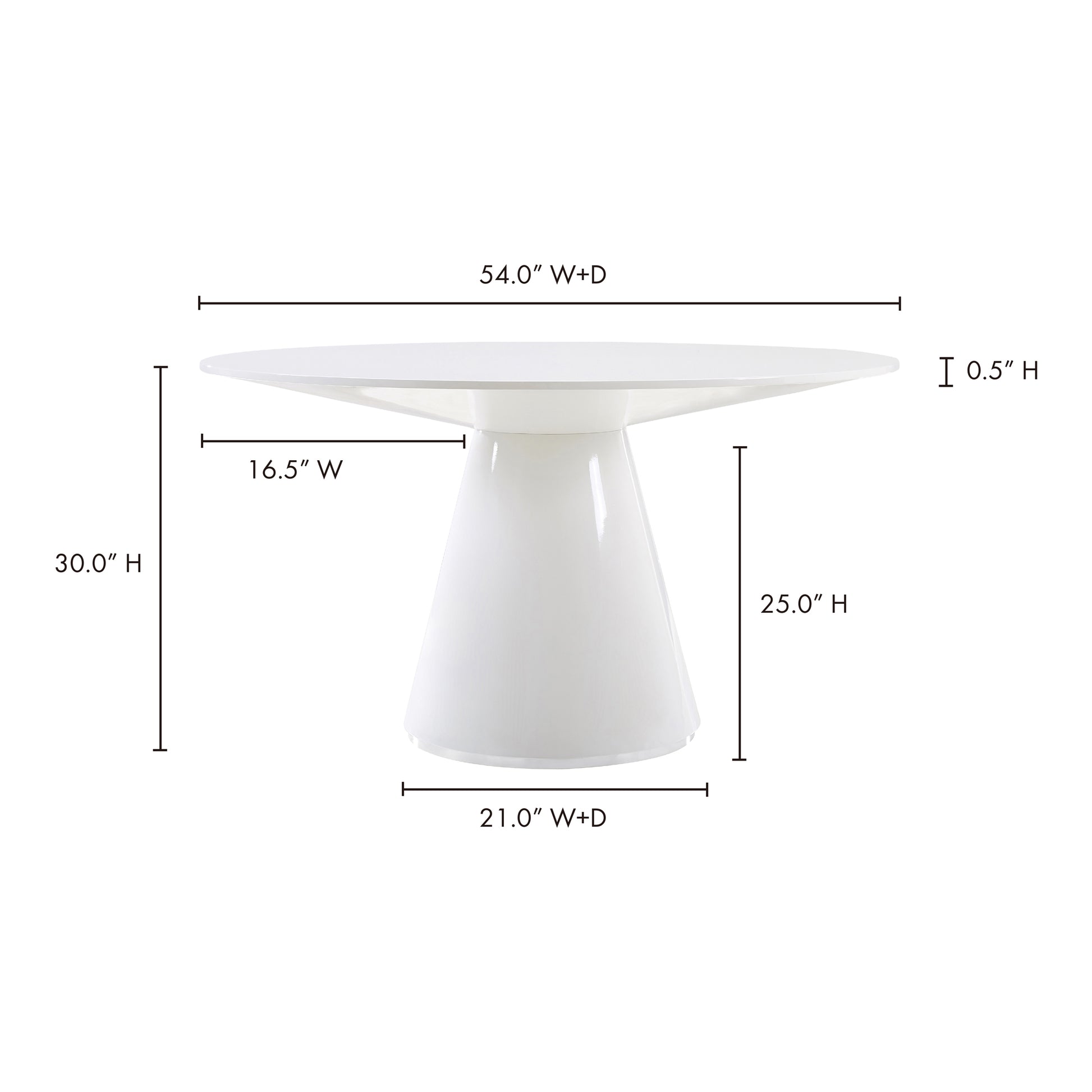Spanning almost five feet, the circular Otago dining table can seat up to eight people in style. The all-white base and top give this table a sleek aesthetic, allowing it to fit seamlessly into any dining room setting. The high-gloss finish and sharp geometric design tops off the contemporary feel.