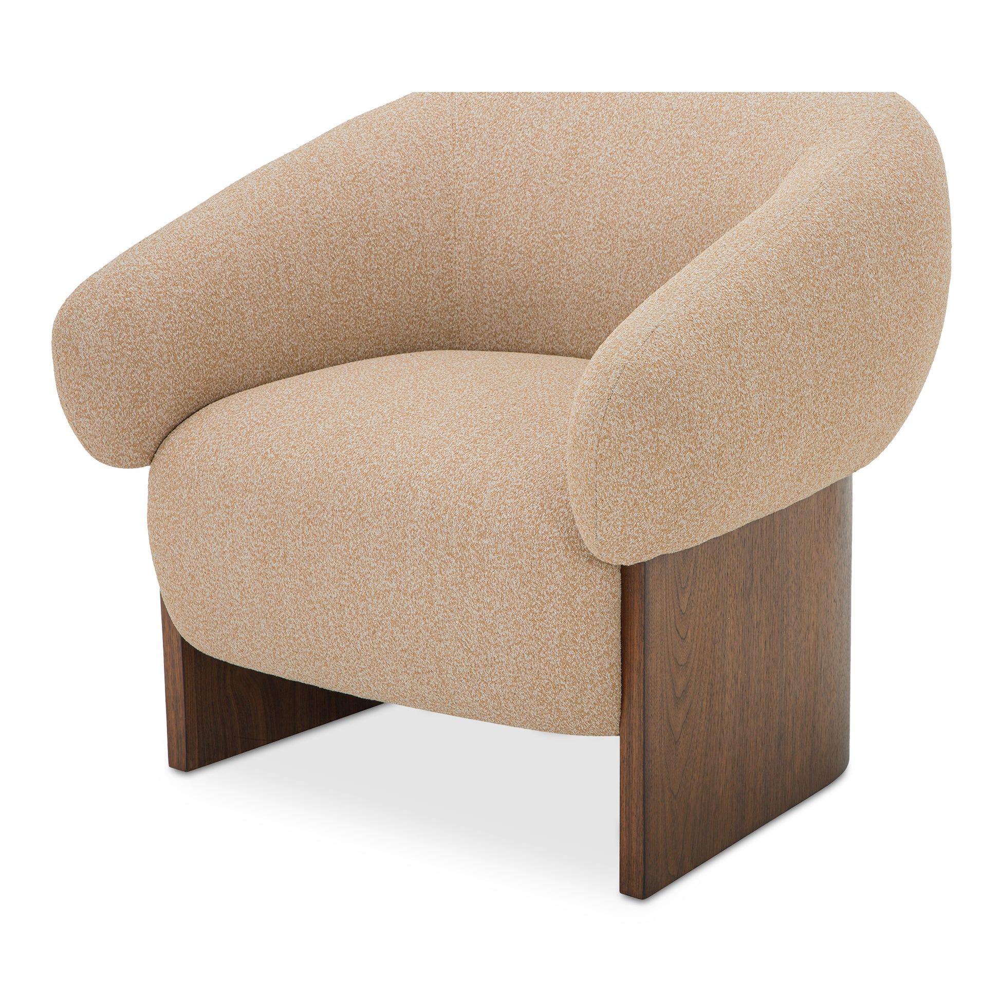 The Otto accent chair merges the robust grace of a walnut veneer over solid rubber wood base with the delicate comfort of a plush, curved back and upholstered in a flecked micro bouclé of 100% recycled GRS-certified polyester that is OEKO Tex 100. With its nuanced texture, this piece floats atop a wooden foundation that brings lightness into any space.