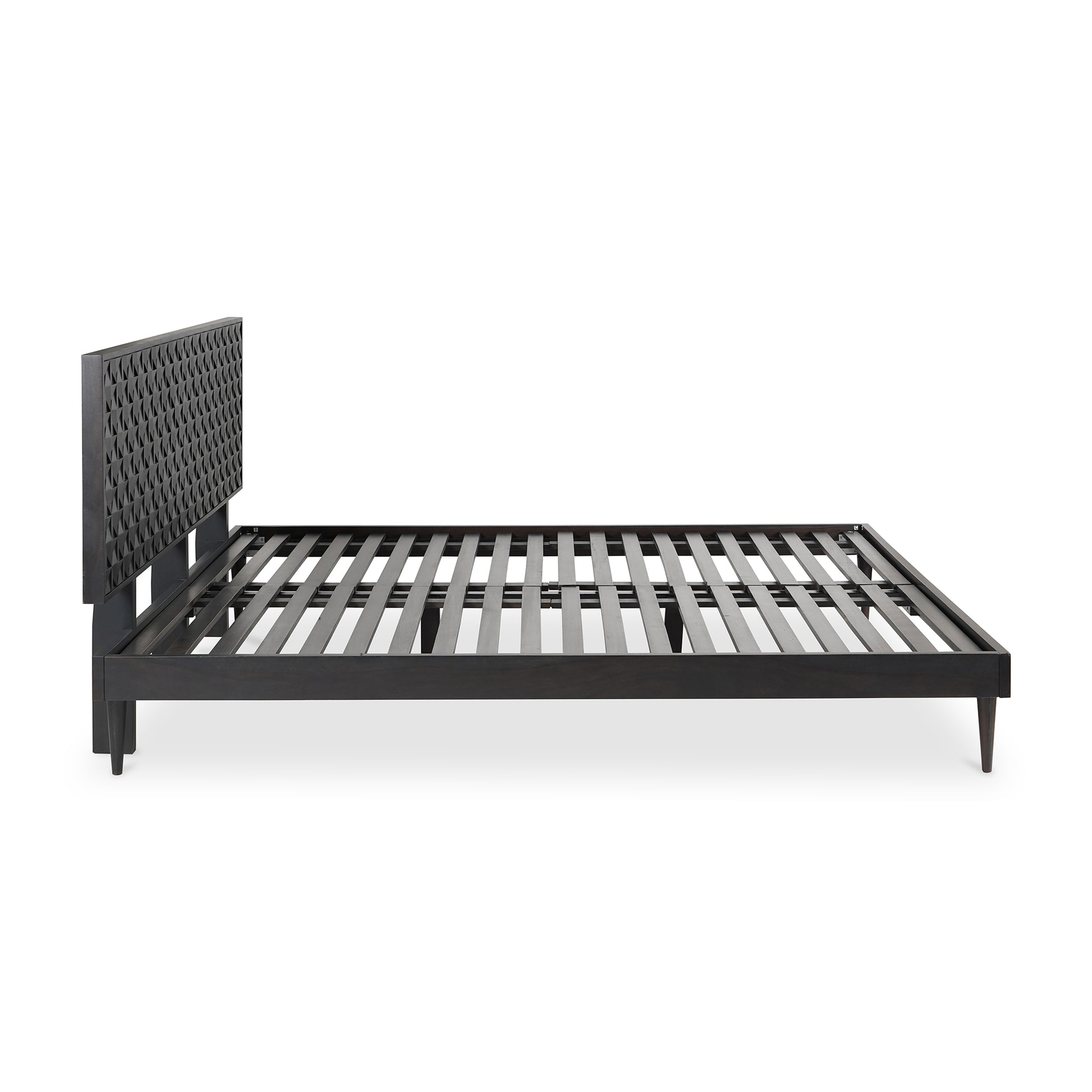 Crafted in solid Sheesham wood with a black finish, the Pablo bed features an intricately designed headboard with each piece carefully arranged by hand. The texture and visual intrigue of the detailed headboard are underscored by the organic beauty of the natural wood, adding inviting warmth to the bedroom.