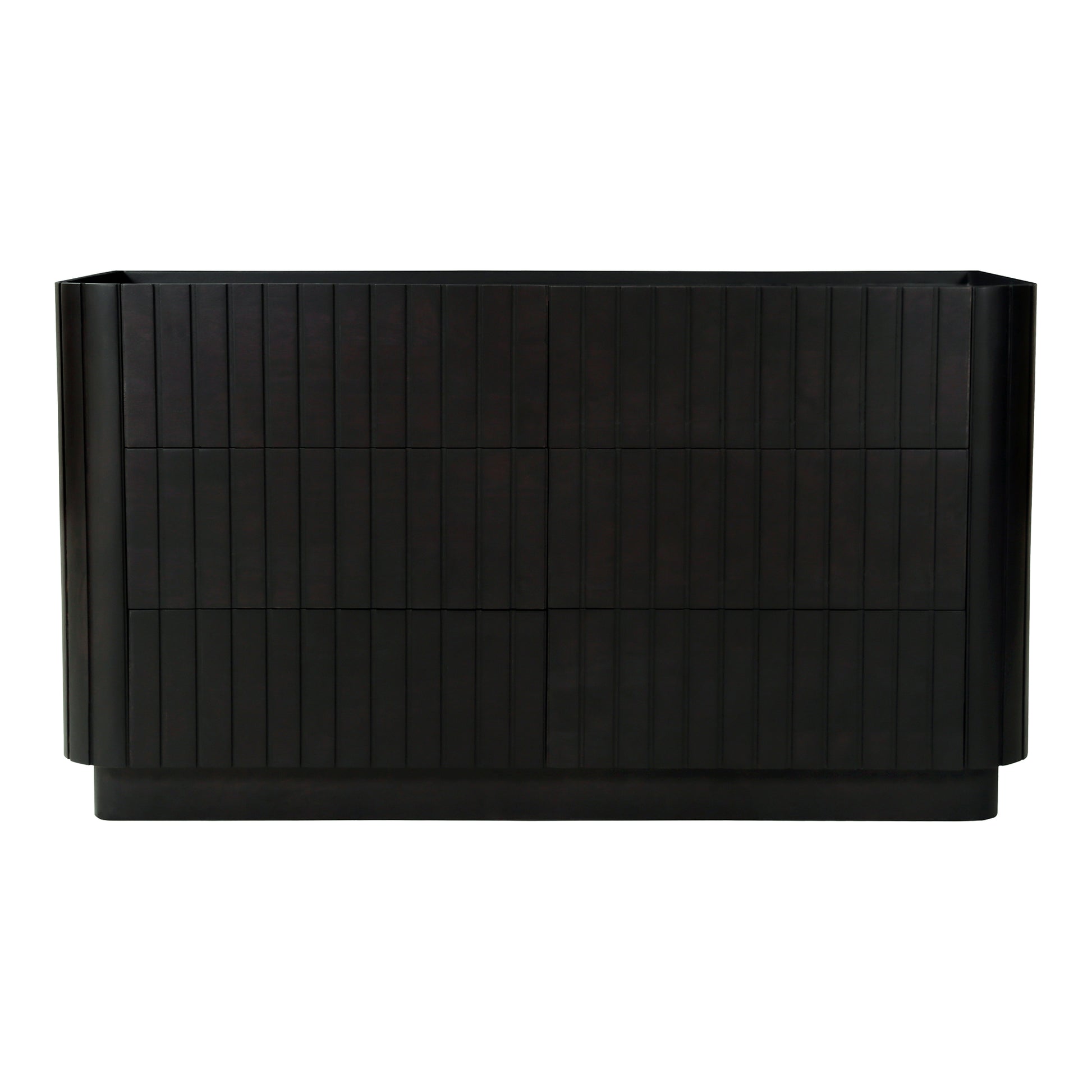 The Povera 6-drawer dresser balances detail and form offering bold statement appeal and ample storage. This piece anchors the bedroom with its Acacia façade's gentle ribbing reminiscent of ripples and waves, adding texture and warmth. A rich black finish with a soft purple undertone allows the natural wood grain to show through. Naturally beautiful with an impactful silhouette, six soft close drawers open with side mount ball bearing glides.