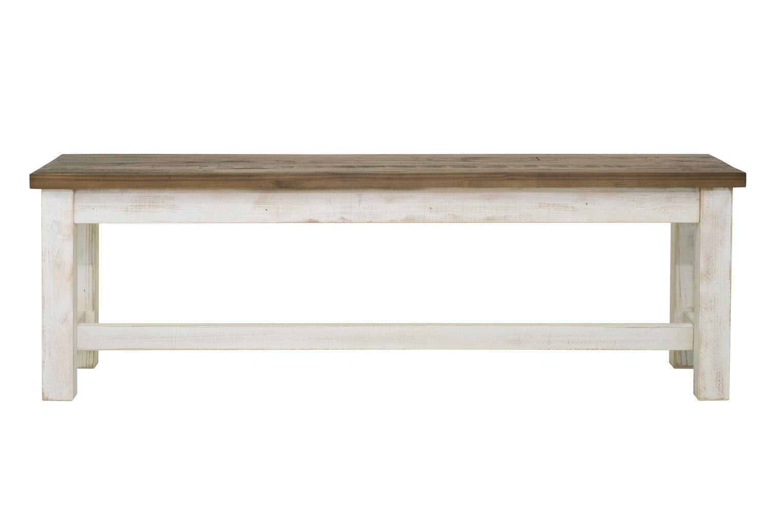 Made from recycled pine. Rustin natural finished top with antique white finished base. Use for extra seating in any room.