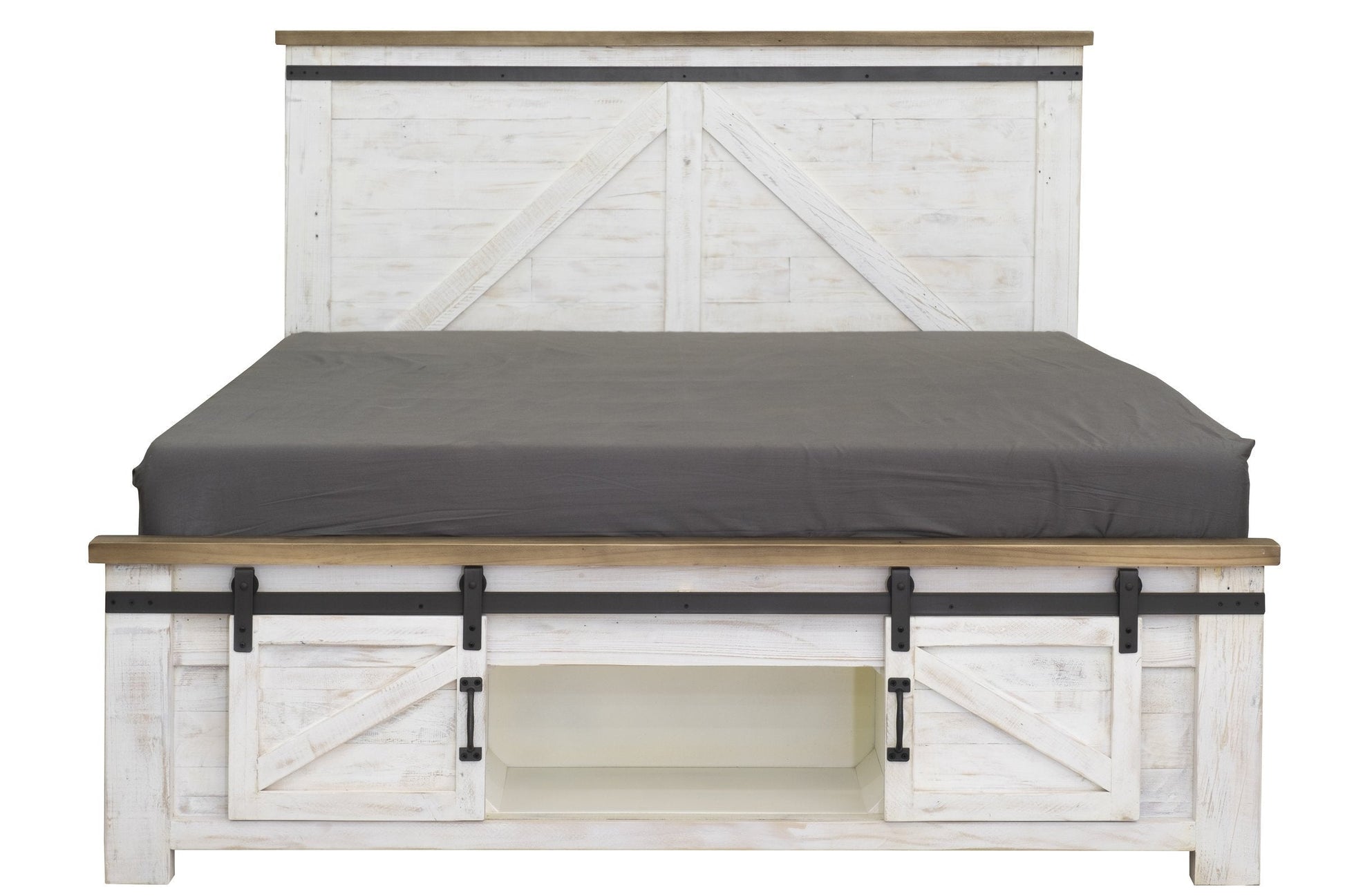 Crafted from reclaimed pine wood for sustainable style and durability. Built-in storage with two sliding doors keeps essentials neatly tucked away. Slat support system ensures optimal mattress support and breathability—no box spring required.