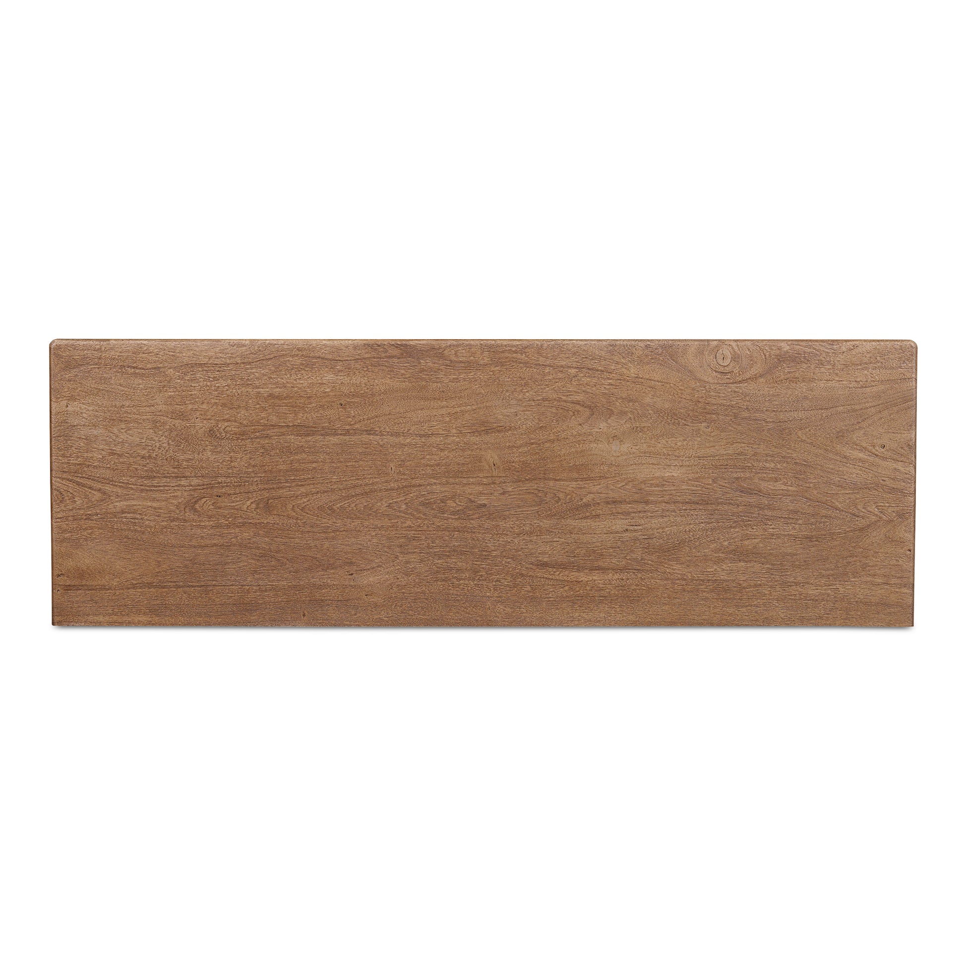 The Rene 6-drawer dresser harmoniously blends traditional charm with contemporary elegance through its beveled feet and mixed material construction. Crafted from solid Acacia wood, its wire-brushed finish reveals intricate grain patterns resting atop hammered iron legs, creating a floating effect. Meticulous craftsmanship shines through wood joinery details and contrasting iron handles as six spacious drawers offer ample storage.