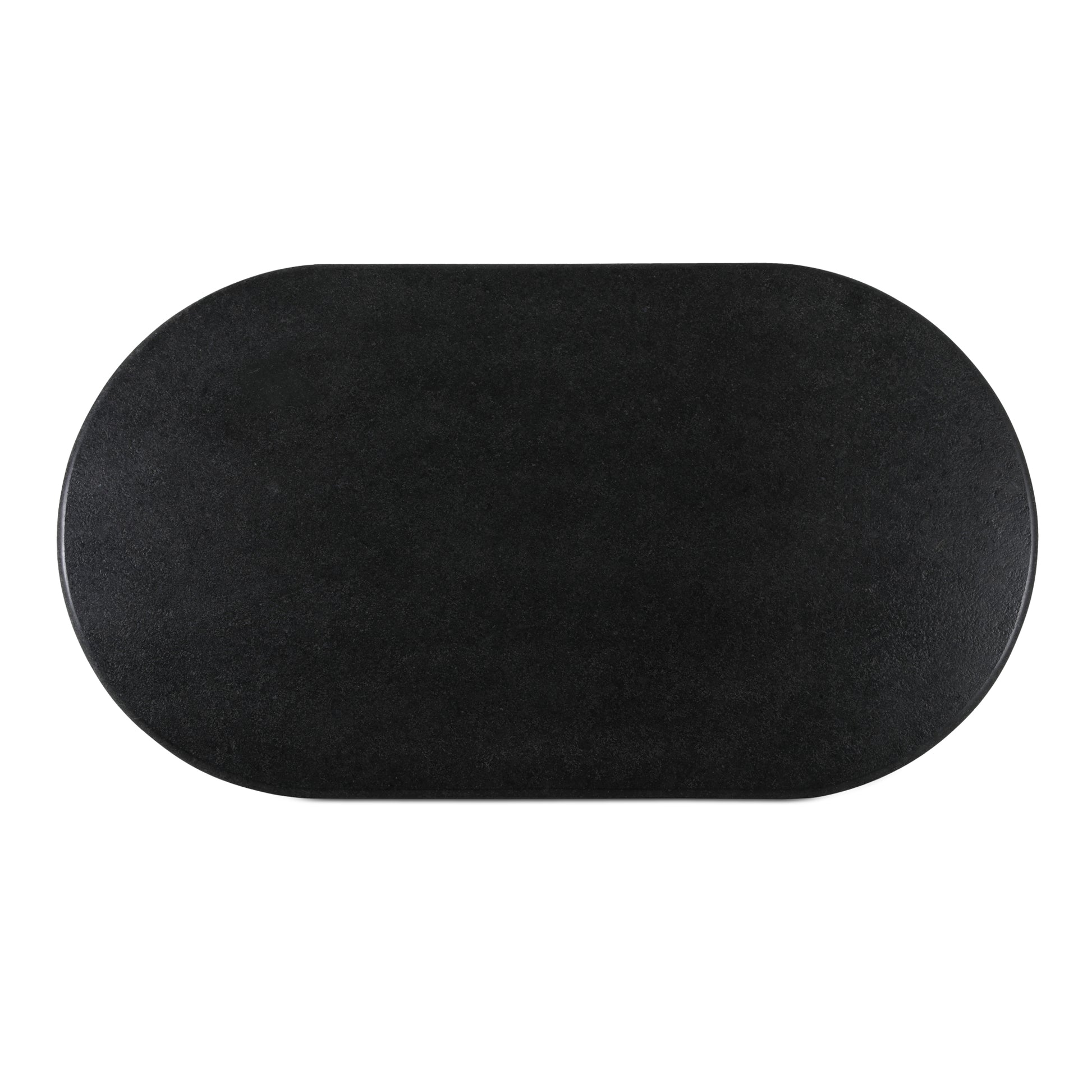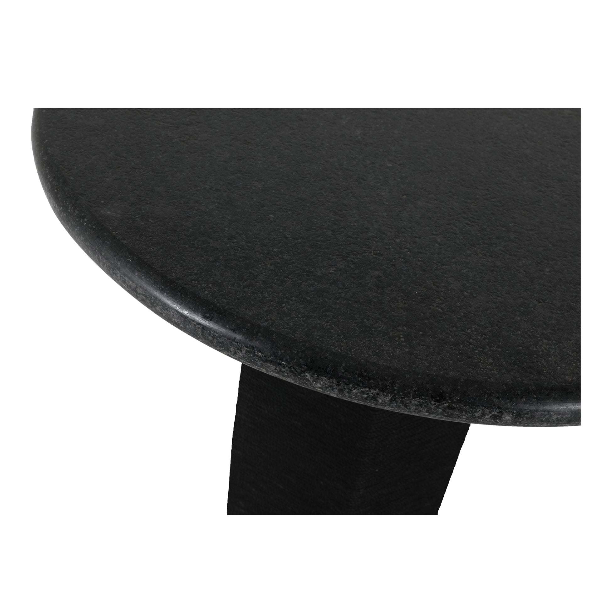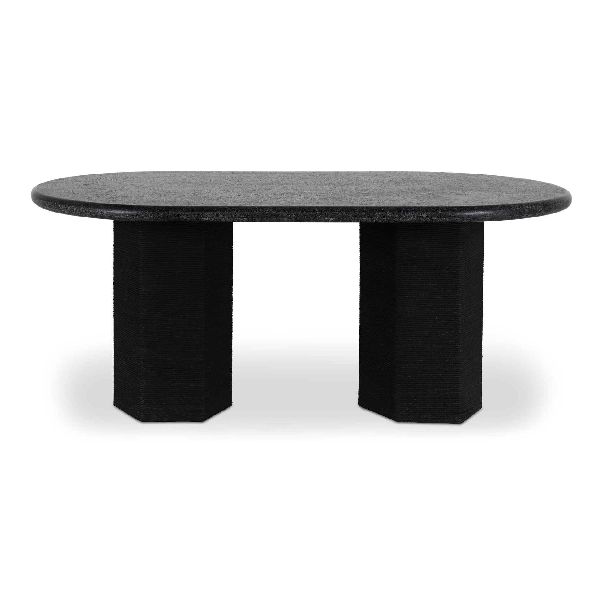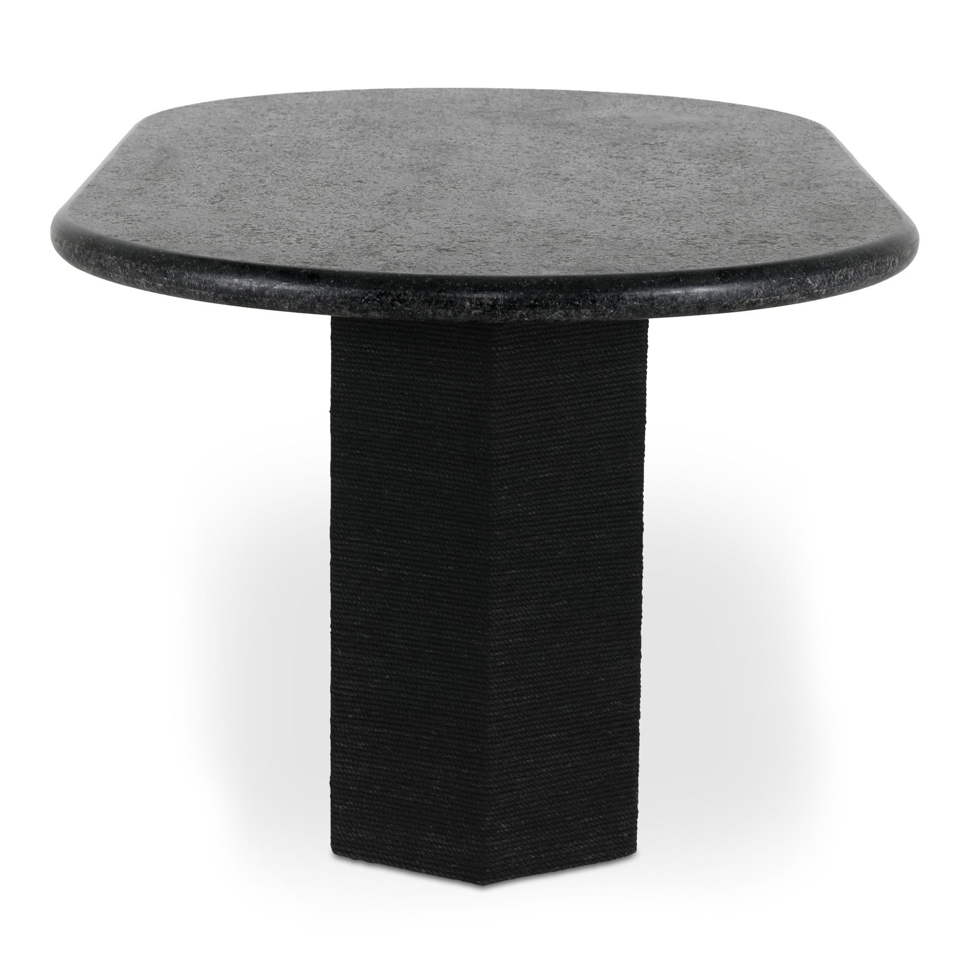 The Sartoria dining table invites conversation and collaboration. Its thick bullnose edge top is crafted with black granite, a reinterpretation of an older material into a weathered finish with a European feel. A jute-wrapped pedestal base complements the vibrant top for a touch of organic texture, function, and support for its smooth, inviting form.