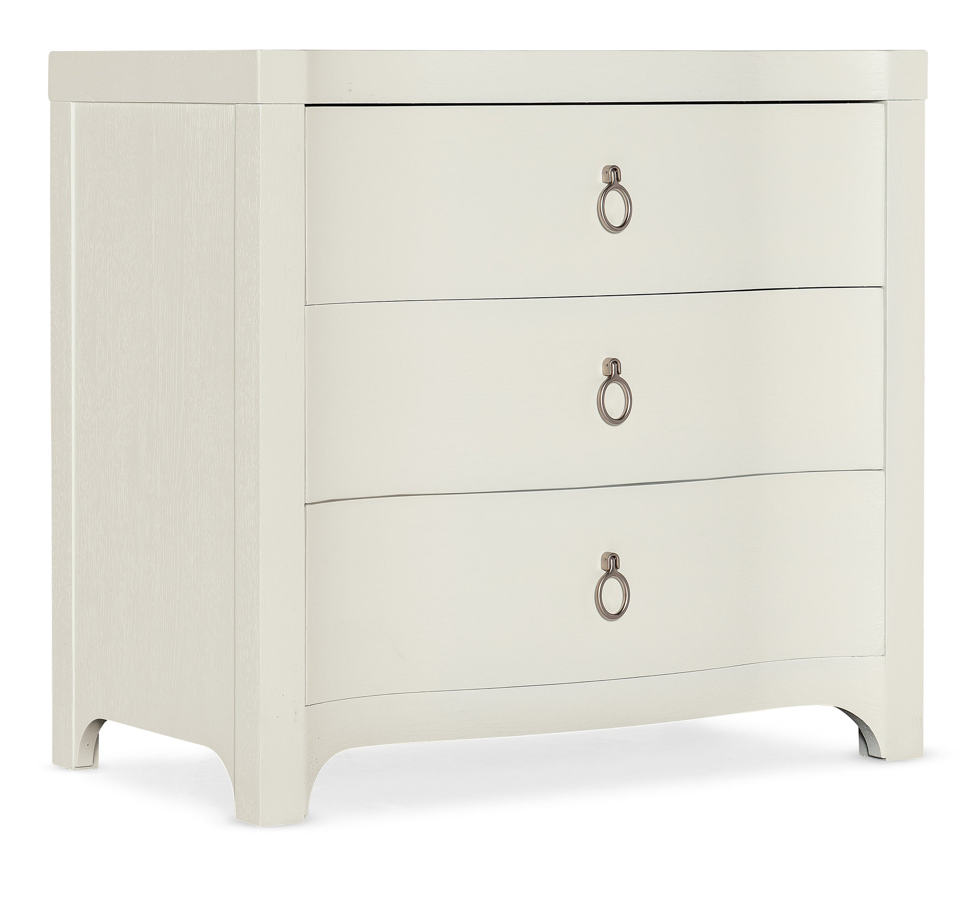 If you aspire to tranquil palettes and clean, crisp silhouettes, the Antigua Three-Drawer Nightstand will bring the peacefulness of the outdoors in with its shaped front and soft textured Shell white finish. Crafted of Oak Veneers, the nightstand has 3 drawers with soft-close drawer guides, a USB charger with two ports and a cord clip on the back. Light champagne decorative ring pulls add a designer touch.