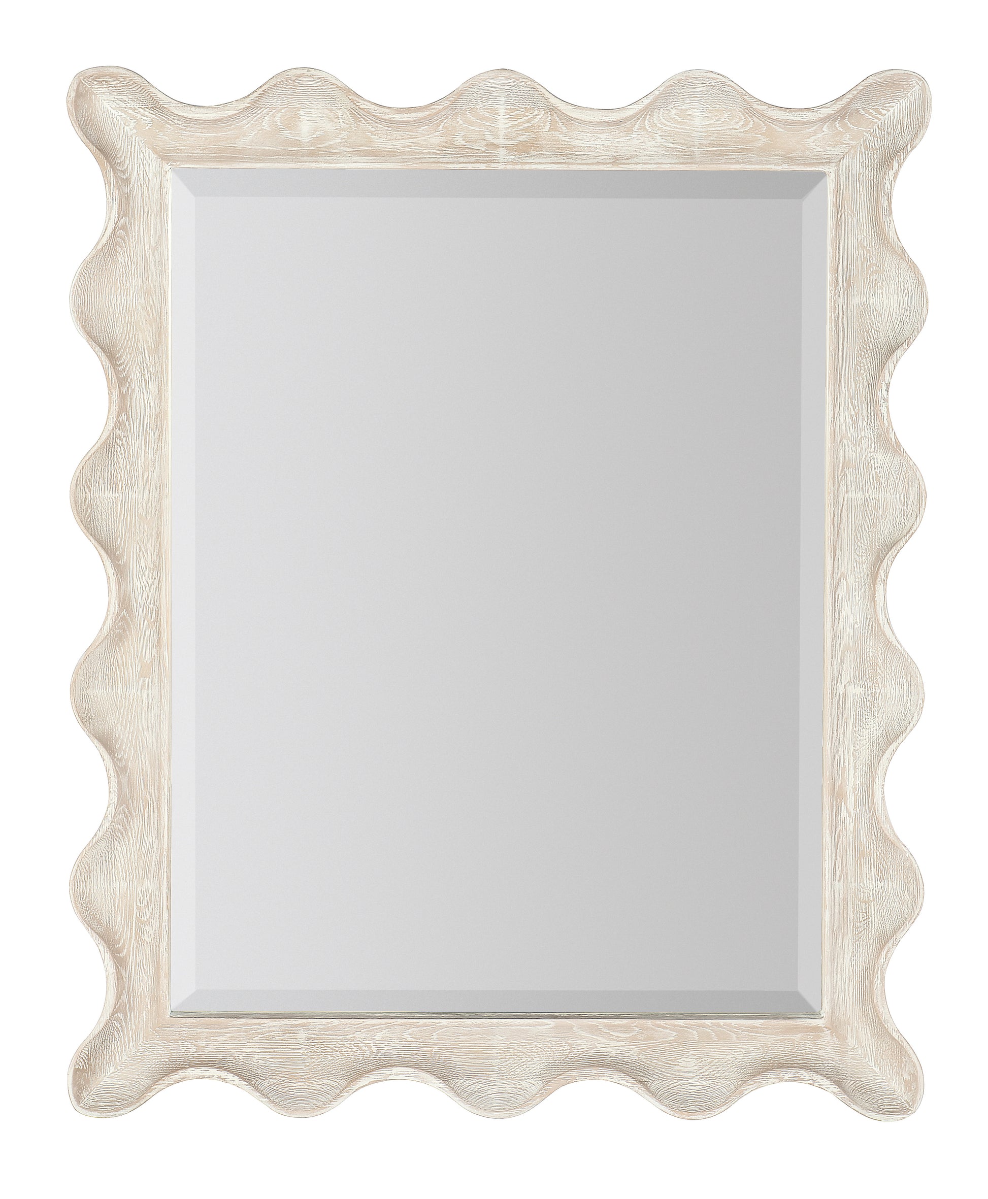 ring the relaxed aura of the outside in with the lovely scalloped-edge Bora Landscape Mirror in the refreshing Surf finish, an airy whitewashed oak with wire-brushing detail.