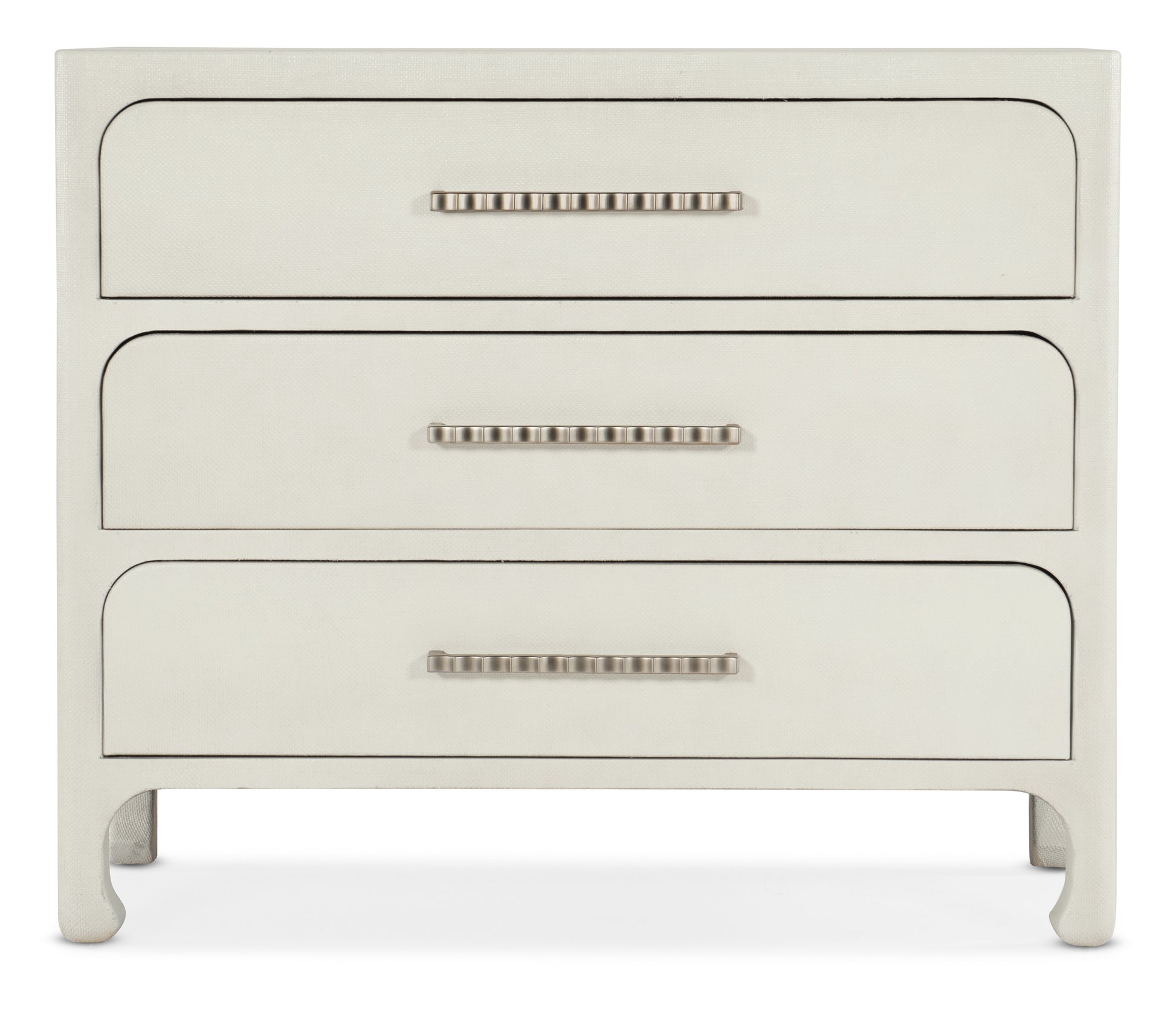 Inspired by casual waterfront living with a chic sophistication, the Cruiser Accent Chest is crafted of Wood and Raffia and finished in Sand Dollar, a white lacquered grasscloth. Chow-style legs and light champagne-colored decorative bar pulls add a designer touch.