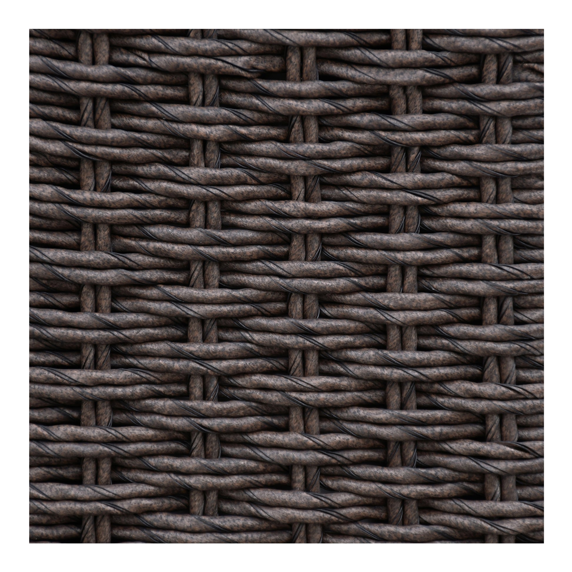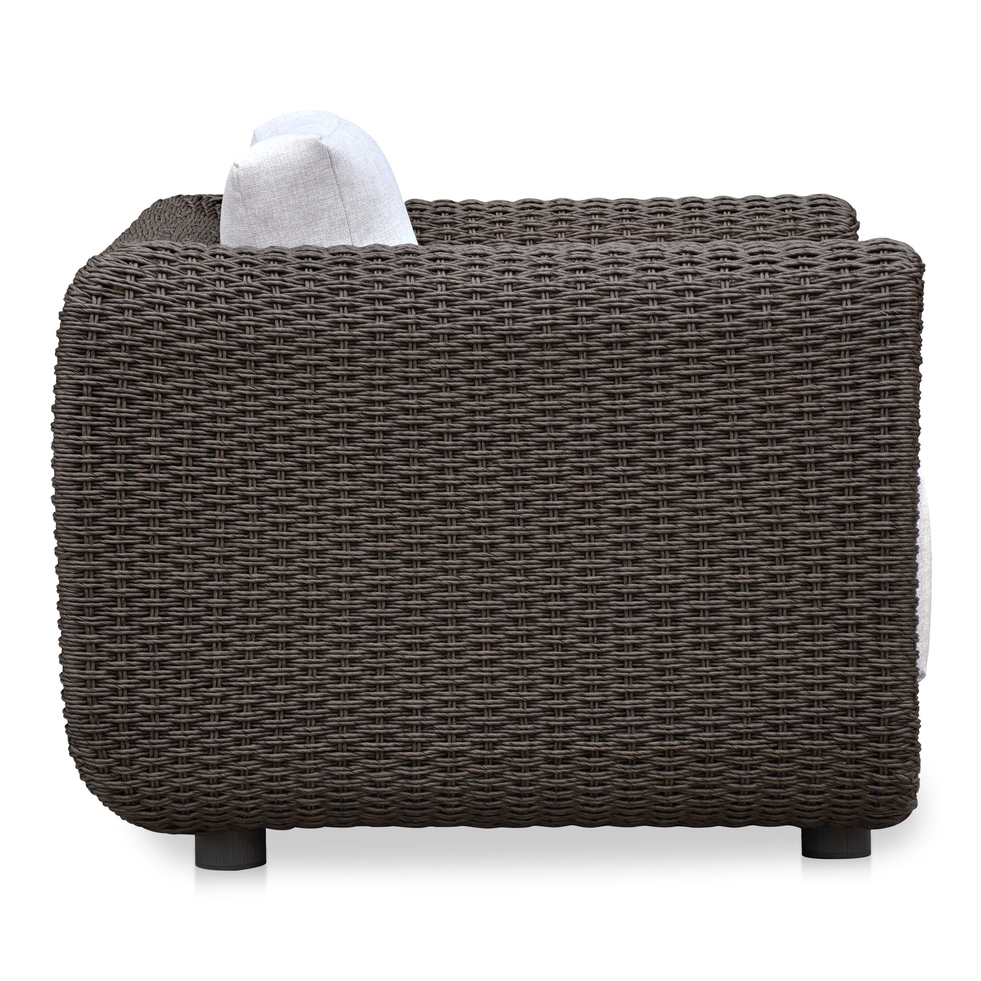 The Soma outdoor accent chair finds a graceful interplay of form and purpose. Its dark brown finished PE synthetic wicker frame and sunproof, heathered Olefin fabric cushions exude poise and durability. Curved, playful arms and quick-dry foam invite relaxation while ensuring timeless panache.