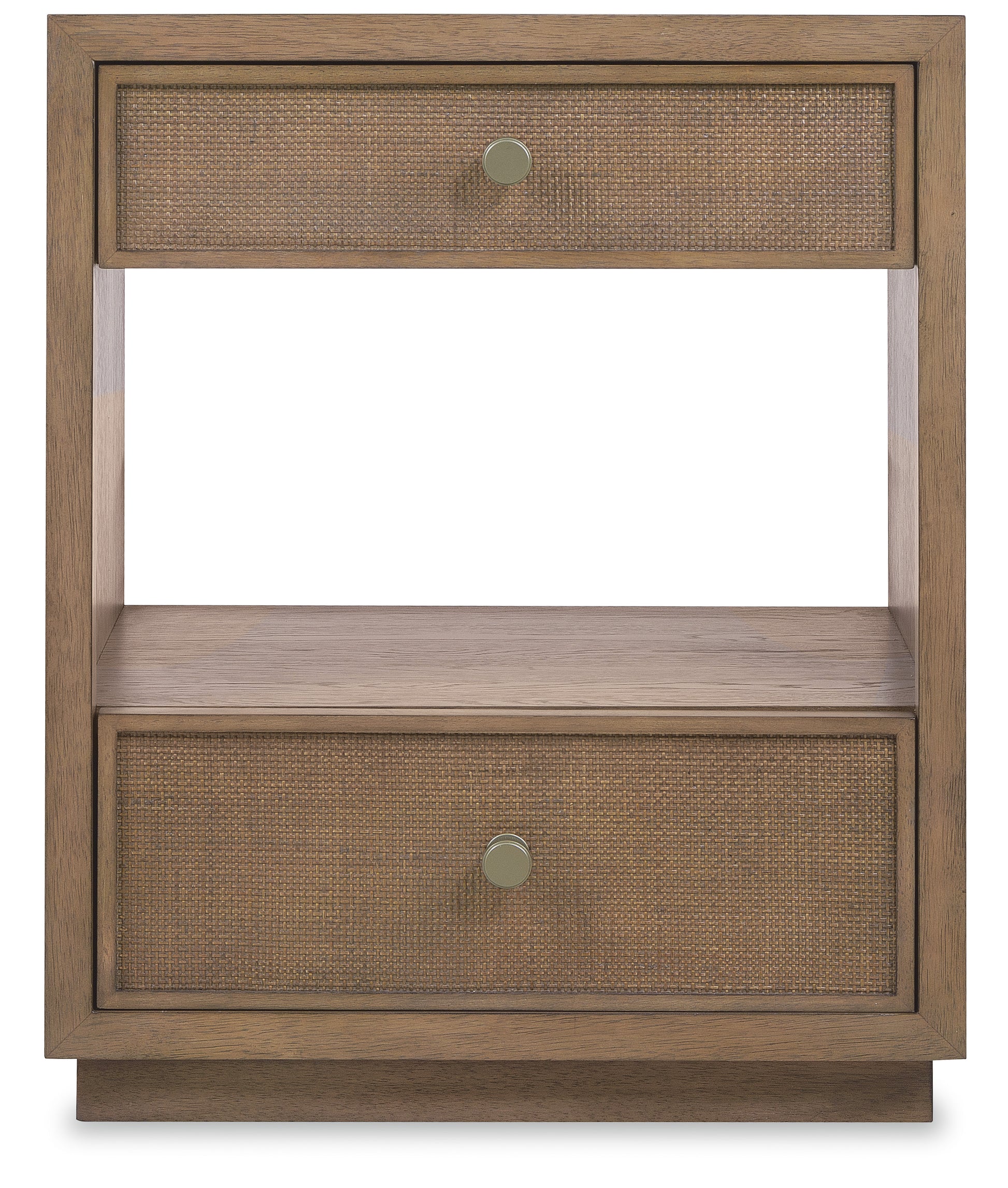 A stylistically versatile nightstand blending natural textures with a light-and-airy modern aesthetic, the Sonnet Nightstand has two self-closing drawers with cane fronts. Crafted of Quartered and Cathedral-Cut White Oak Veneers in a light earthen-toned finish, it has an open space above the bottom drawer for storage and a cord clip on the back panel. The plinth base and satin-finished knobs add chic modern appeal.