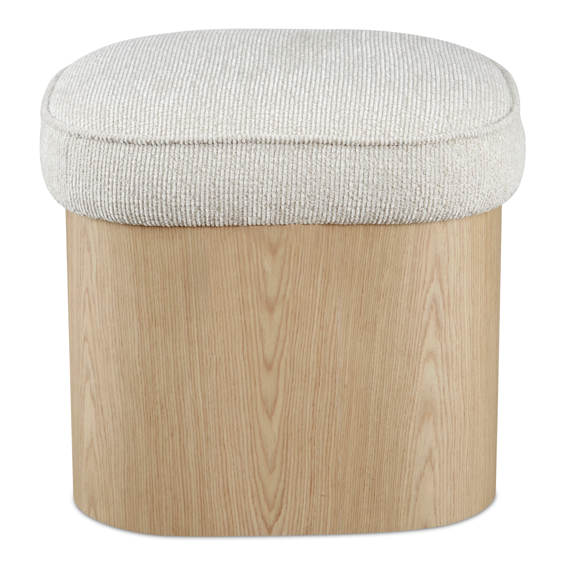 The Sonny stool elegantly articulates the luxury of simplicity with an ash veneer base and a lift top that unveils discreet storage. Upholstered in flecked oatmeal fabric, the plush seat contrasts the wood's solid nature with piping that traces its contours. Curved corners soften the stool's silhouette, creating a serene yet functional piece.