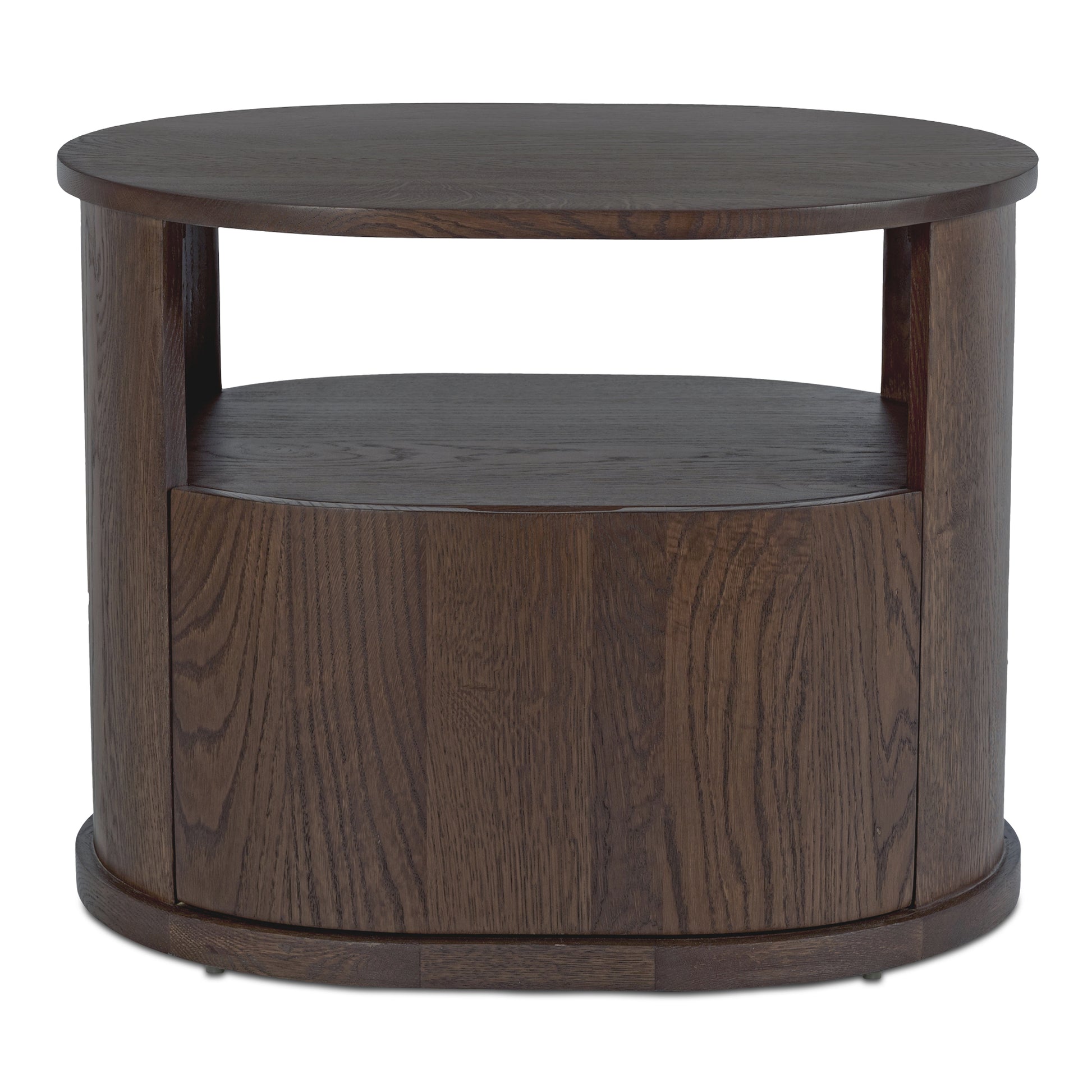 The Tommy nightstand embraces modern simplicity in rich dark brown. Its distinctive racetrack capsule shape adds a contemporary touch to the bedroom, seamlessly blending form and function. This nightstand features a solid oak frame with oak veneer details, offering durability and refined style. The soft-close drawer and open shelf provide versatile storage options in a piece that speaks to modern appeal.