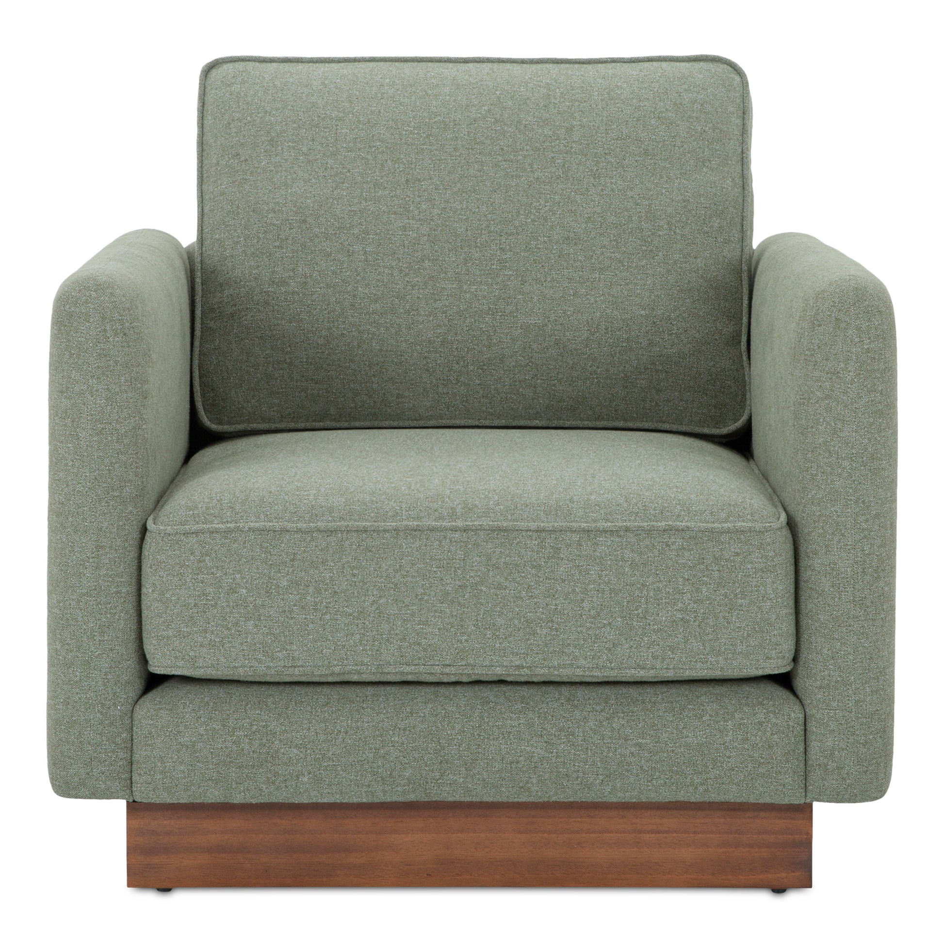 The Vernon accent chair blends mid-century design with modern functionality. It features a wooden plinth base for an elevated, lighter appearance. This chair offers unmatched comfort with removable cushions. Upholstered in durable, OEKO-TEX and Green Guard-certified fabric, it is ideal for family living, combining everyday practicality with durability.