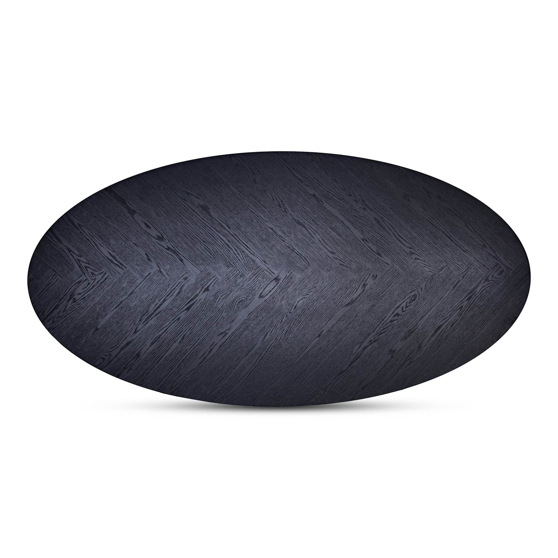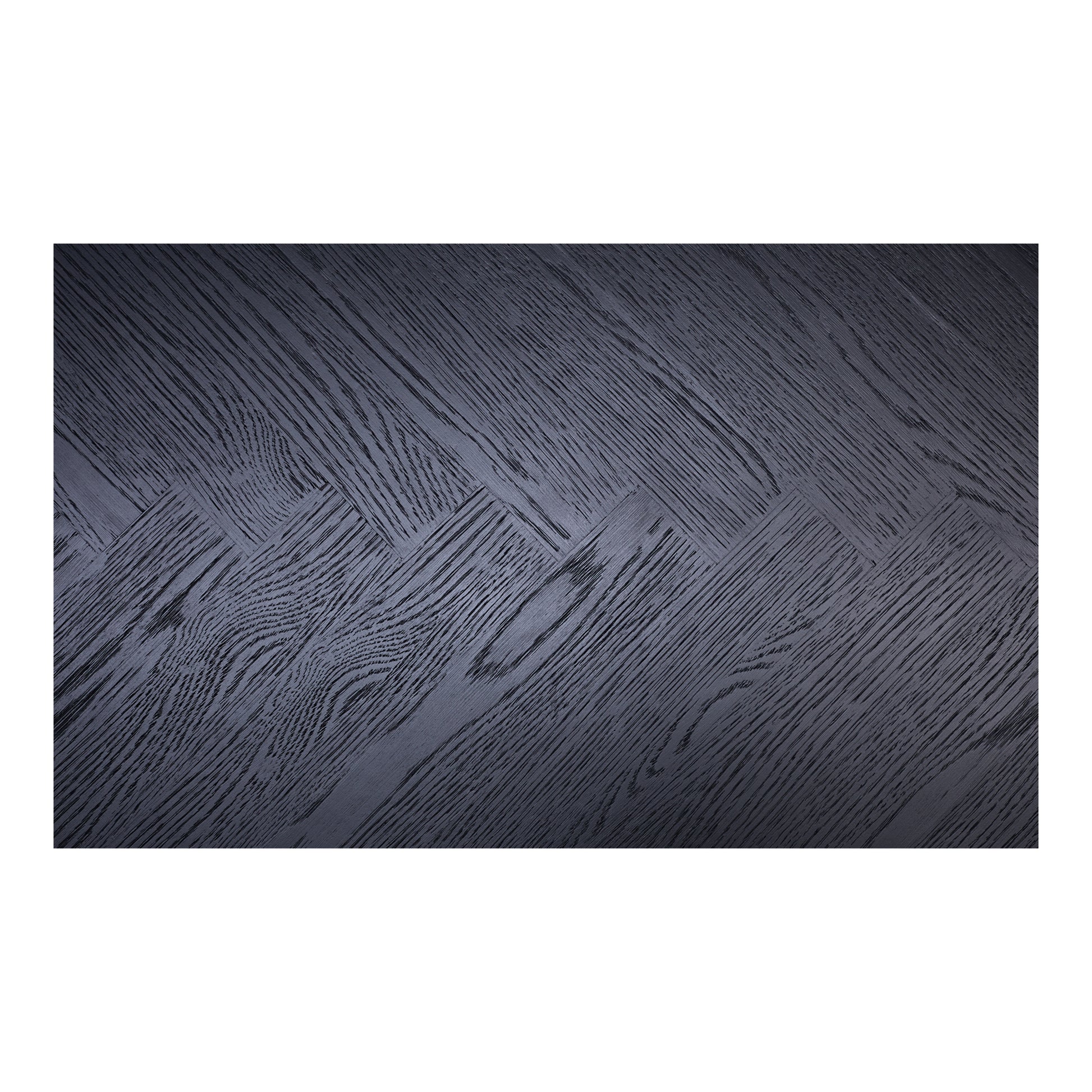 The William dining table showcases a contemporary silhouette with a rounded edge base and beautifully detailed herringbone pattern tabletop. The black stain finish adds a sense of maturity, complementing the captivating parquetry pattern on the exterior surfaces. A thick tabletop enhances the overall aesthetic appeal, underscoring the rustic pattern.
